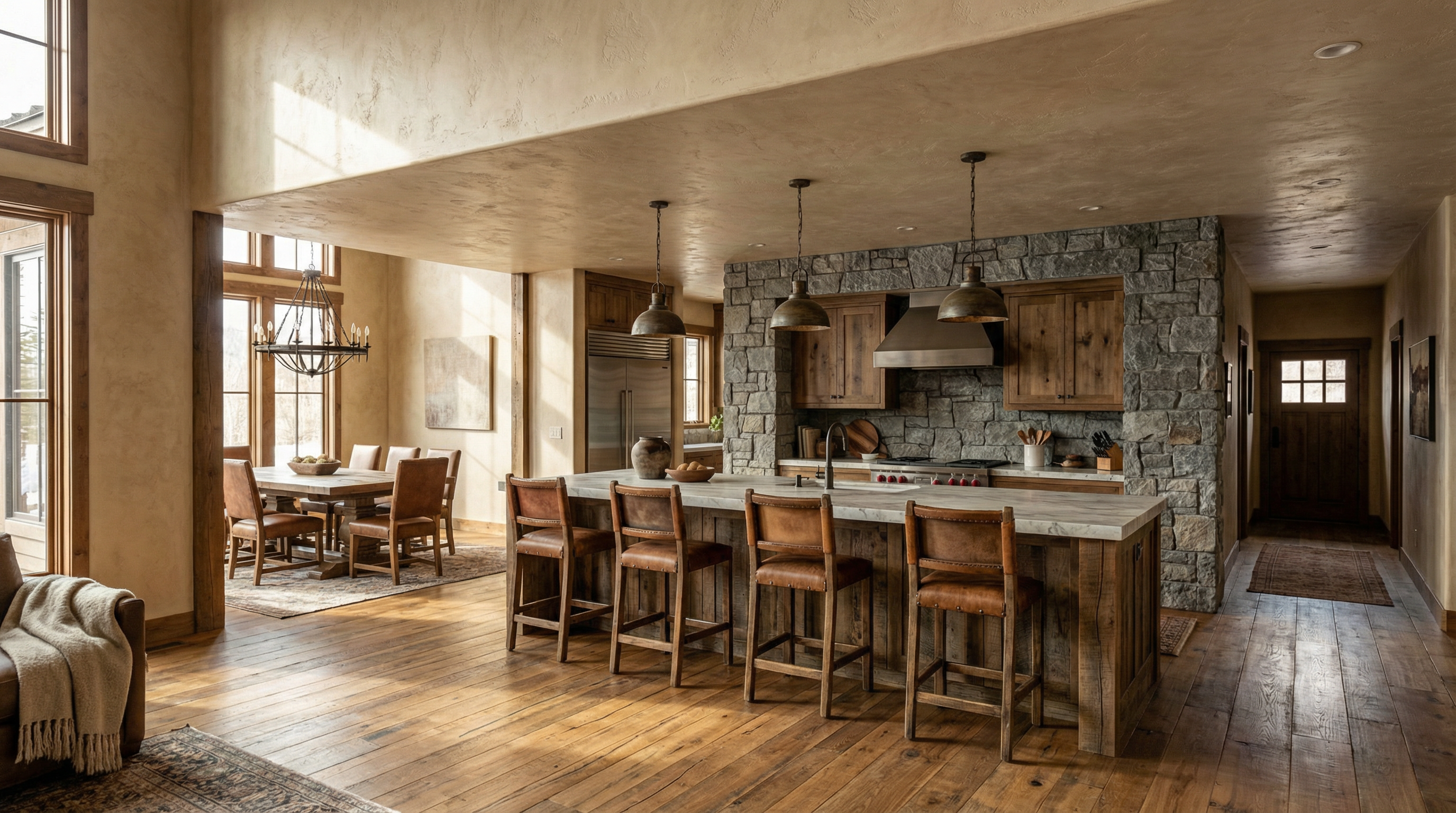 produce a beautiful architectural rendering of a stone and glass greenhouse the glass walls and roof reflect the passing clouds and are framed with black aluminum mullions the bottom panels of the curtain wall are infilled with bronzed colored spandrel panels through the glass you can see a hint of the rustic timber framing the greenhouse is bookended with thick beige stone walls the background rises in elevation as a forested mountain side fills the distance the foreground is of a paver motor court paved with grey stones