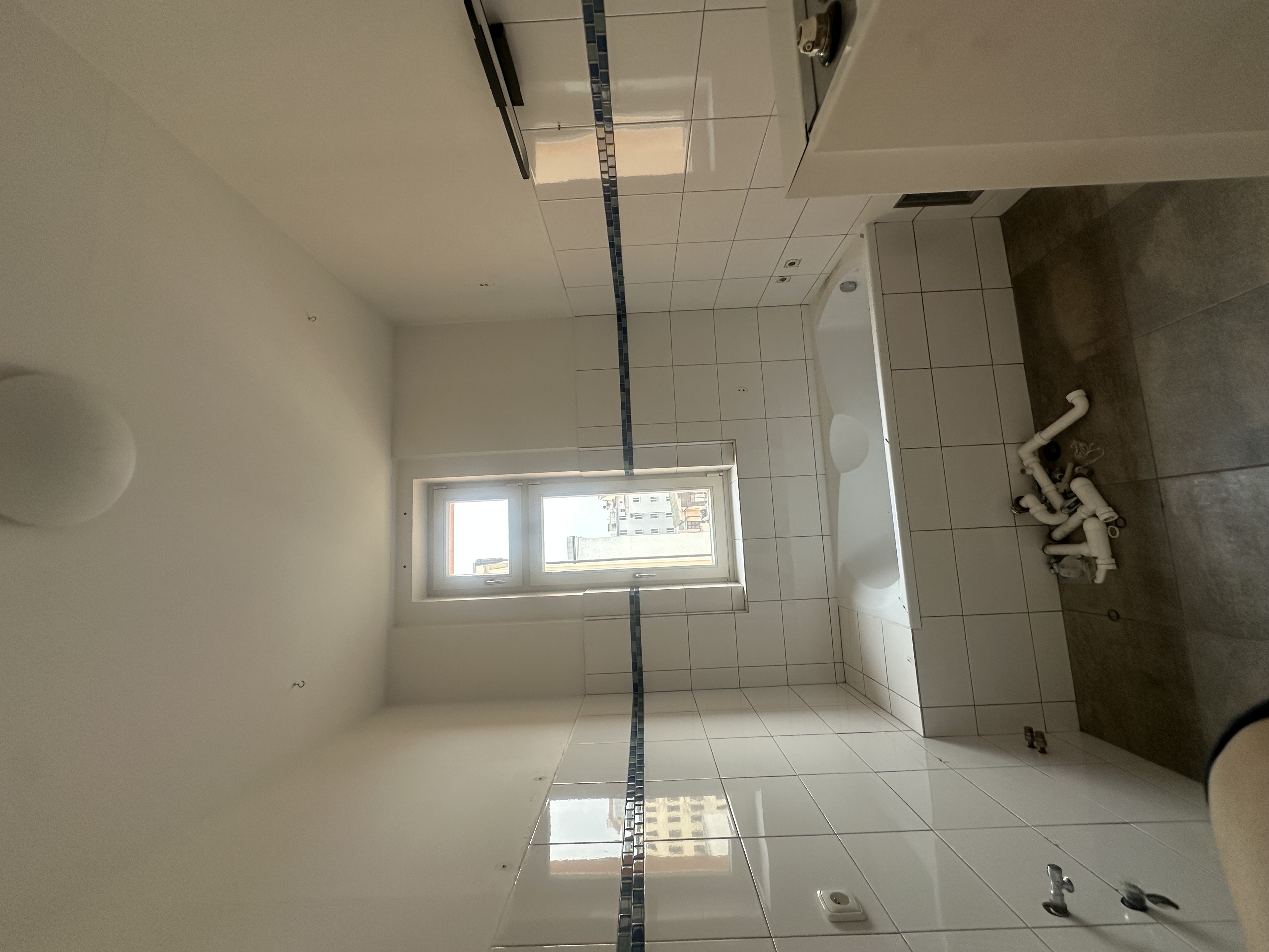 exterior shot bathroom bath stays where it is two sinks on the right no cabinet under white pearl tiles with the floor tiles as on inspiration photograph modern elegant feel