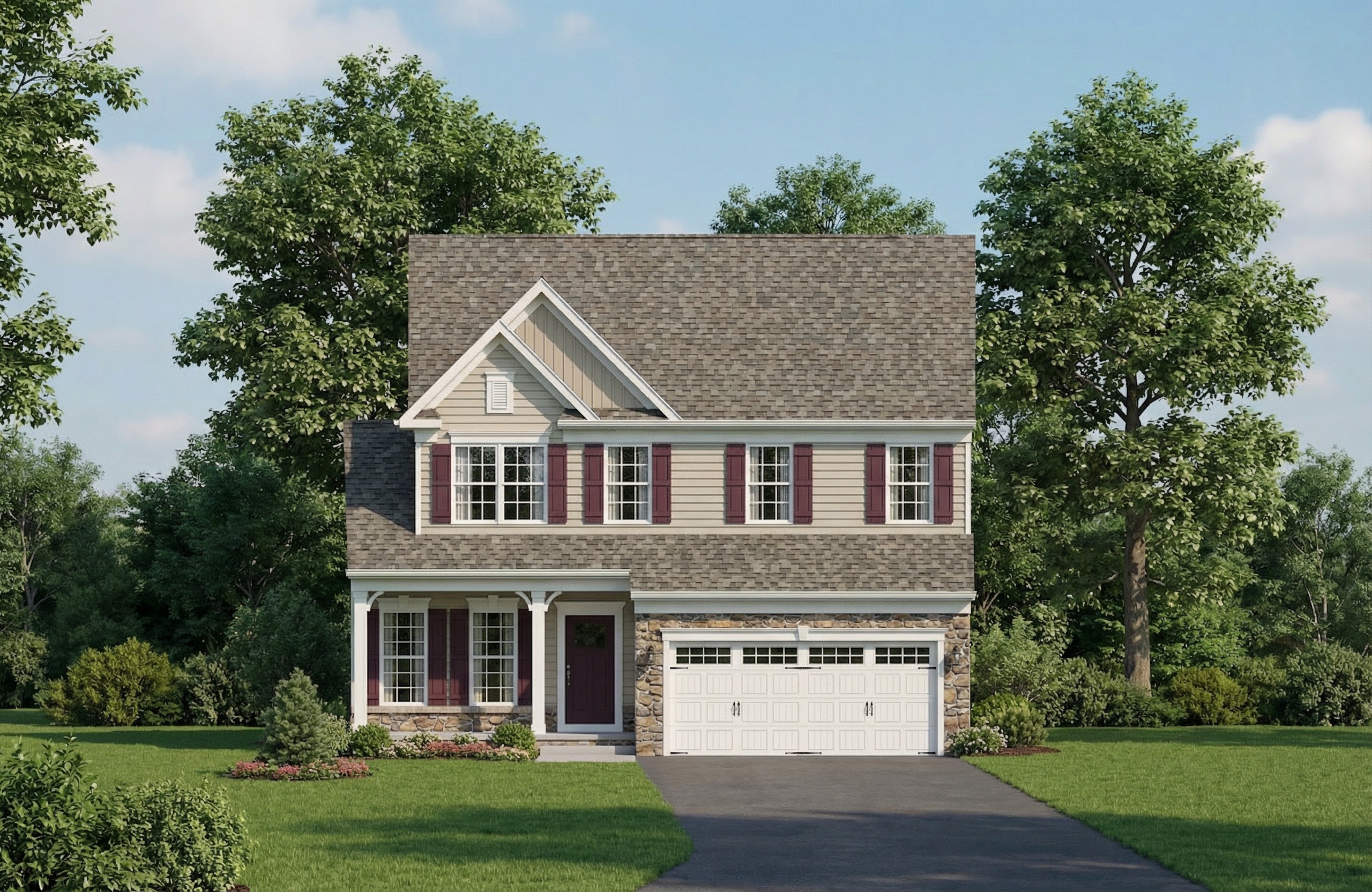remove the additional protruding or stepped piece on the garage door header so it becomes completely flat and simple exactly like the flat header above the front door in the drawing the garage header should be a single straight flat stone siding band with no extra layers or molding on top do the same for the bottom floor windows on the porch the two windows to the left of the front door remove any additional header pieces or decorative trim above them so they become completely flat and simple matching the flat clean header style of the front door keep the stone base siding colors shutters roof and all other elements exactly the same maintain the realistic photo style and lighting but simplify those specific header details to be flush and flat like the drawing