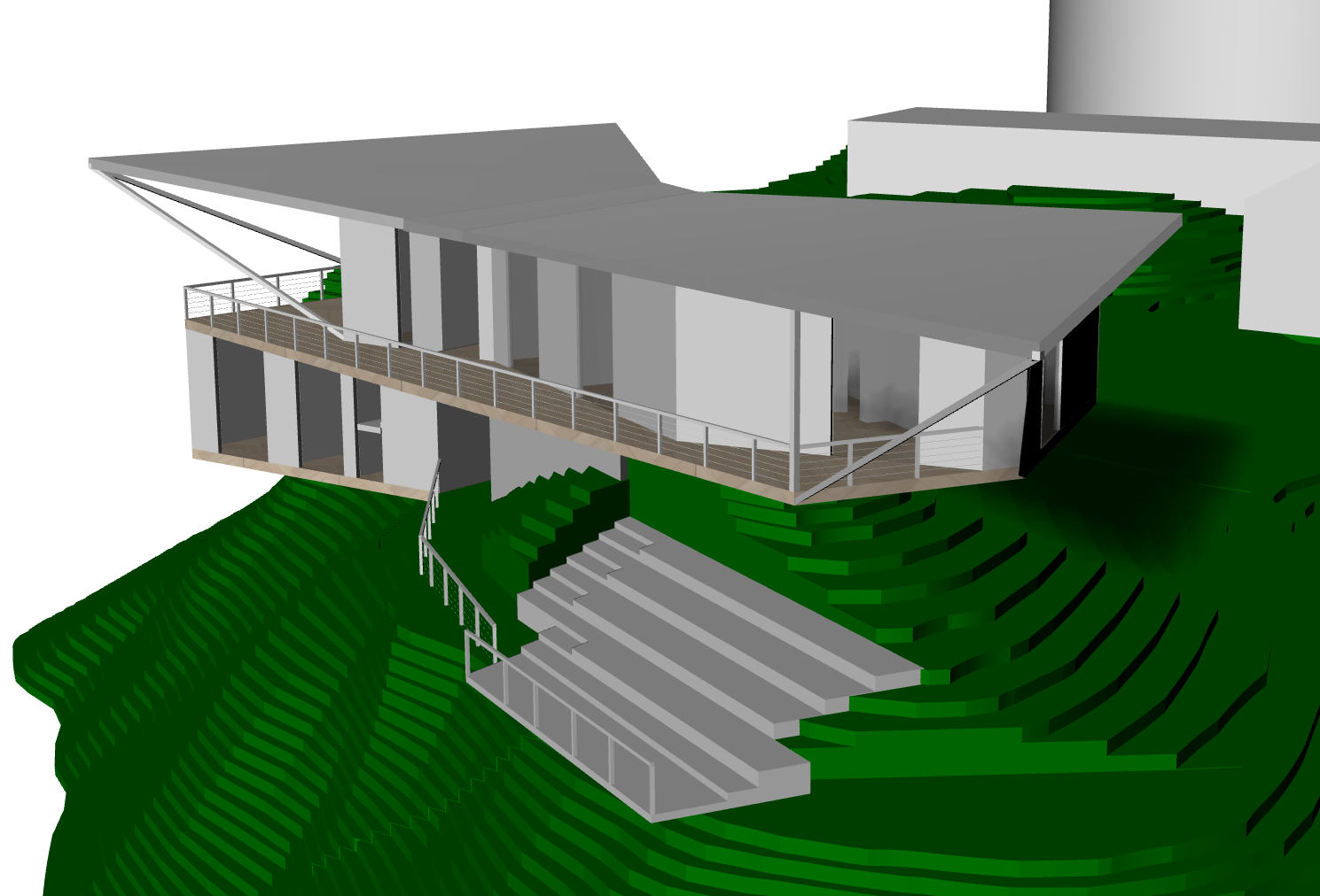 render the building in this image with soft textures the roof is a black standing seam roof the walls are light wood like a cabin render the image so it architectural dimension overlay make it look like a technical sketch add trees and a blue sky with clouds in the background and smoothen the topography and cliff make the overall render look softer and brighter make the green look more pastel and smooth without layers