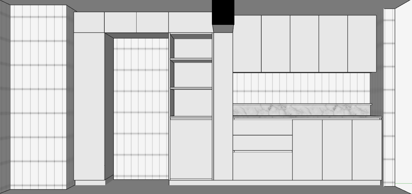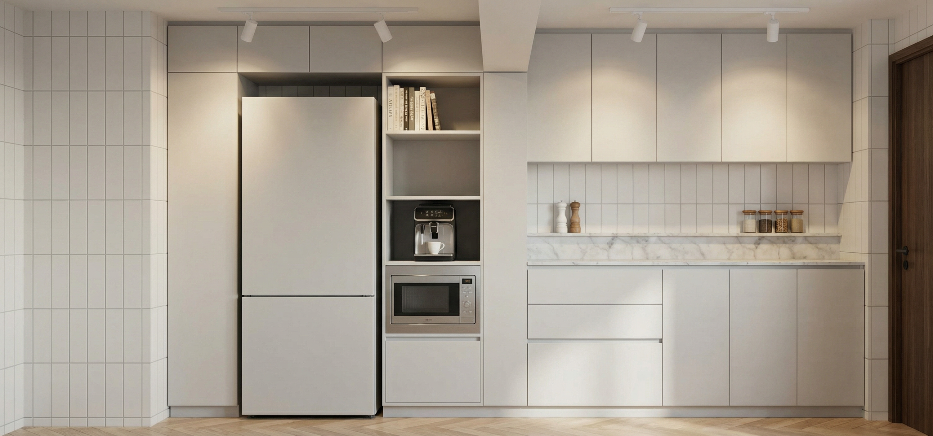interior rendering instructions light colored wooden parquet flooring laid in a 45 degree herringbone pattern matte white ceramic wall tiles 30x10 cm installed vertically carrara marble countertop very light gray cabinetry with a clean modern finish add a dark black door on the right side with vertical wood grain no decorative elements and shown closed place a refrigerator integrated into the niche on the left in the small central niches a microwave in the lower niche an electric coffee machine in the middle niche books in the upper niche in the large niche with a marble countertop place salt and pepper shakers and spice jars on the upper marble ledge all in a scandinavian style include two short ceiling tracks each with two white spotlights turned on