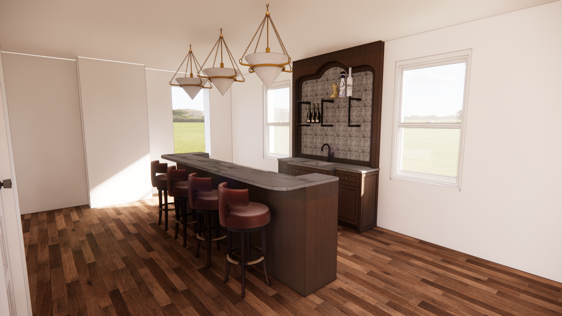 add strip lighting to bar and make the back of the floating shelves antique mirror
