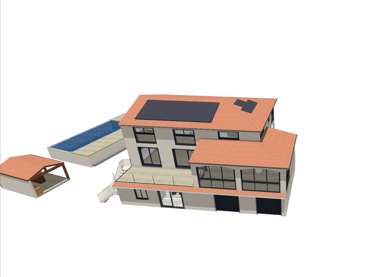 exterior shot a modern house with a warm and welcoming atmosphere the building features a terracotta colored roof and solar panels in sleek dark tones the walls are a soft beige complementing the overall minimalist design large black framed windows add a touch of elegance the wooden patio is a light sandy color leading to a clear blue swimming pool a matching gazebo with a terracotta roof stands nearby the setting is lit by a golden sunset casting gentle shadows and highlighting the residence s architectural beauty