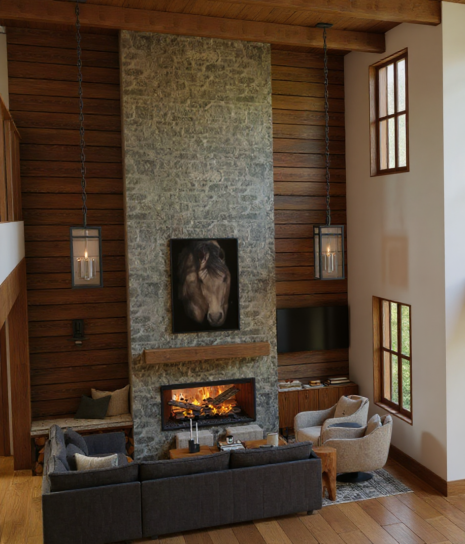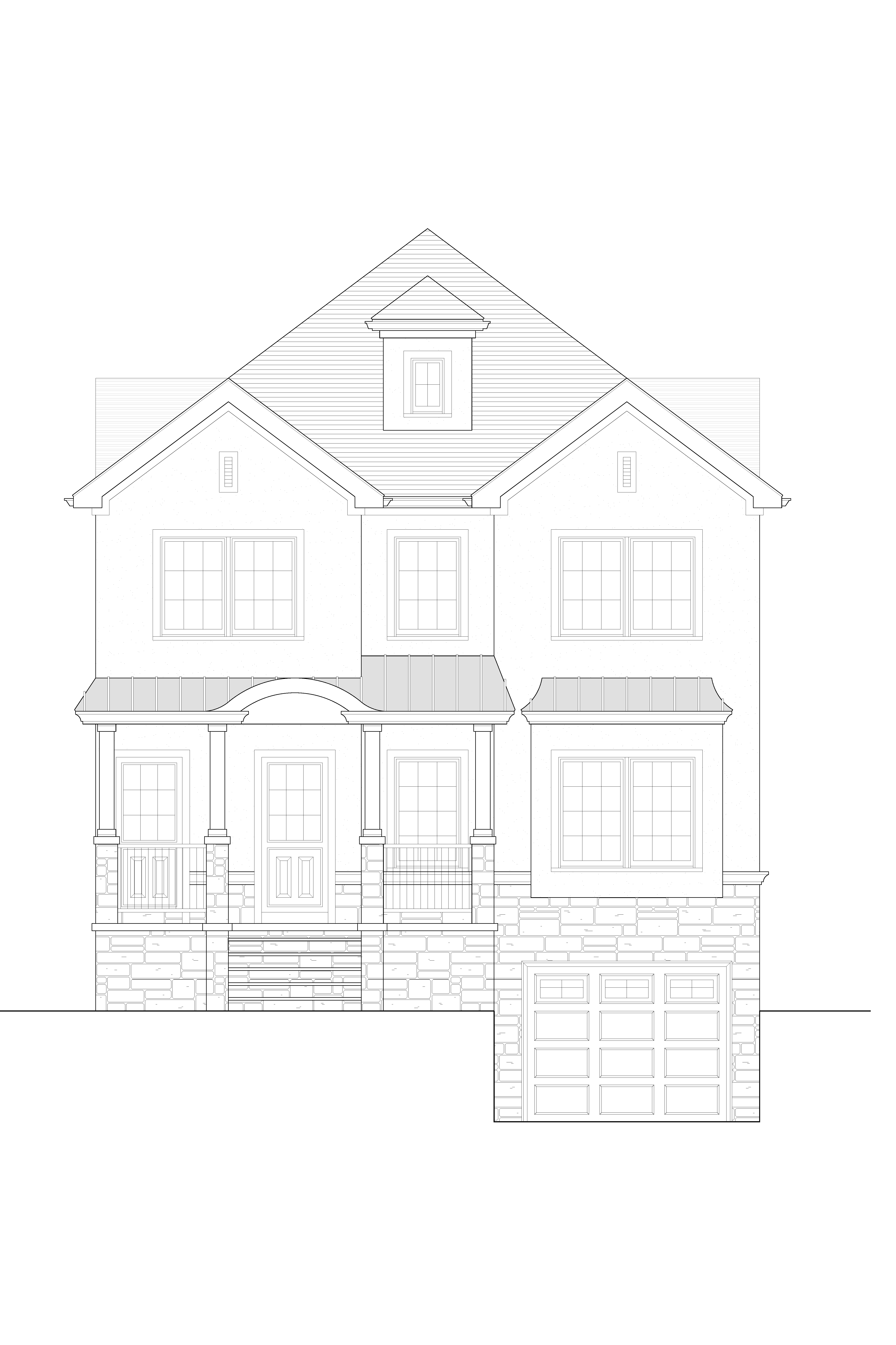 please make a realistic render with brown tones and black window frames set in a residential neighborhood with large mature trees keep everything as is from last render but make the siding much lighter in color