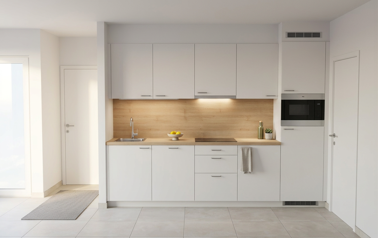 do not change the geometry and colors and materials the ceiling light fixtures should be turned on more daily light the armchair should be yellow its design can be made more modern and comfortable but it must remain with yellow upholstery the dining chairs should also keep their yellow upholstery preferably similar to the upholstery of the armchair so that there is visual consistency the sofa located in the bottom right corner partially visible should have green upholstery the green should be neutral earthy and slightly darker to create a calm and balanced look the coffee table should have a white marble top on the far right side where the windows are visible there should be curtains it is important that nice natural daylight enters the space tv located on the central wall should appear more reflective glossier surface