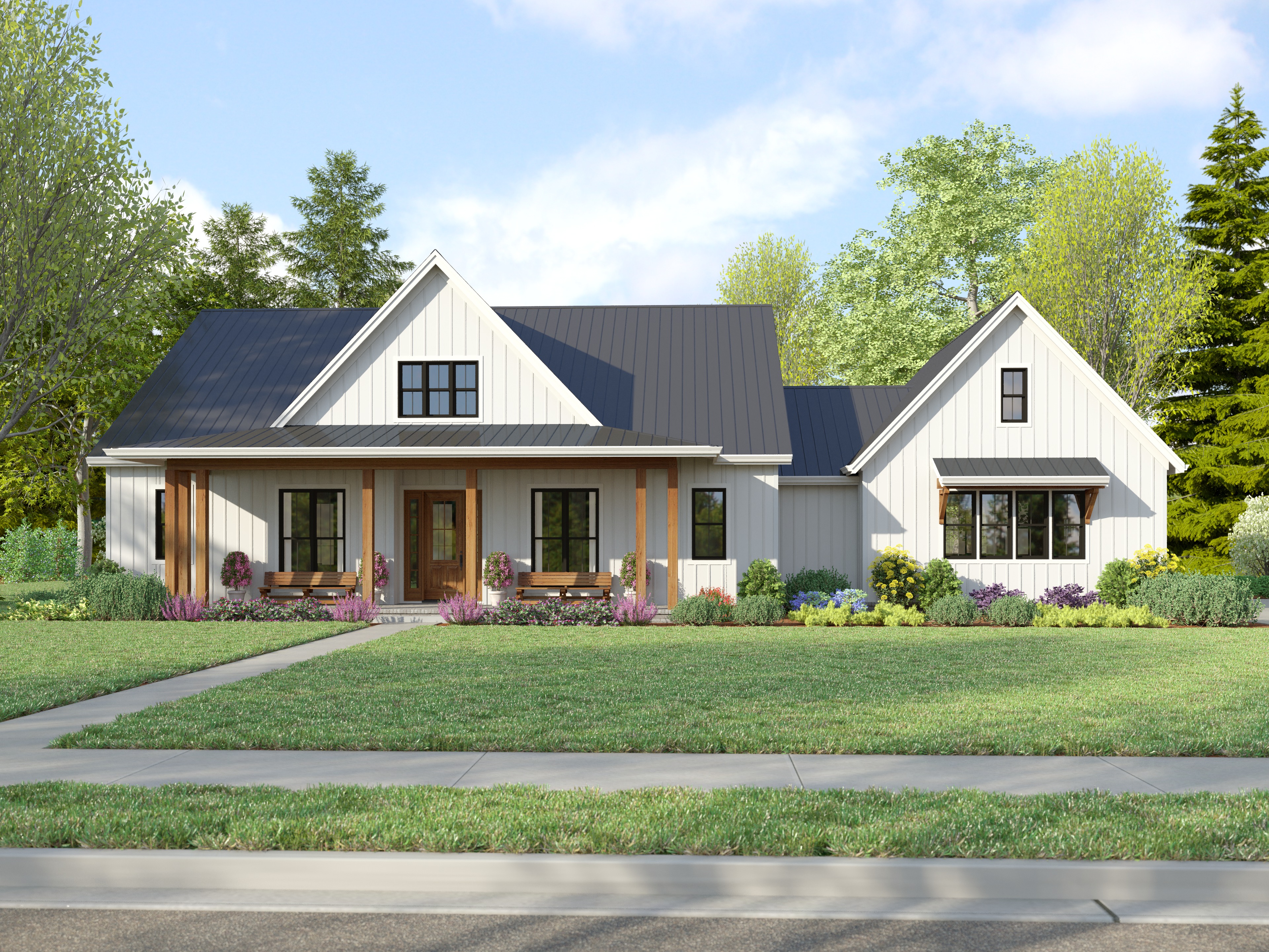 change the weather to a clear winters day it is not snowing ther is snow on the roof a shoveled driveway a snowman on the lawn the trees are bare and no flowers important do not change the architecture or landscaping