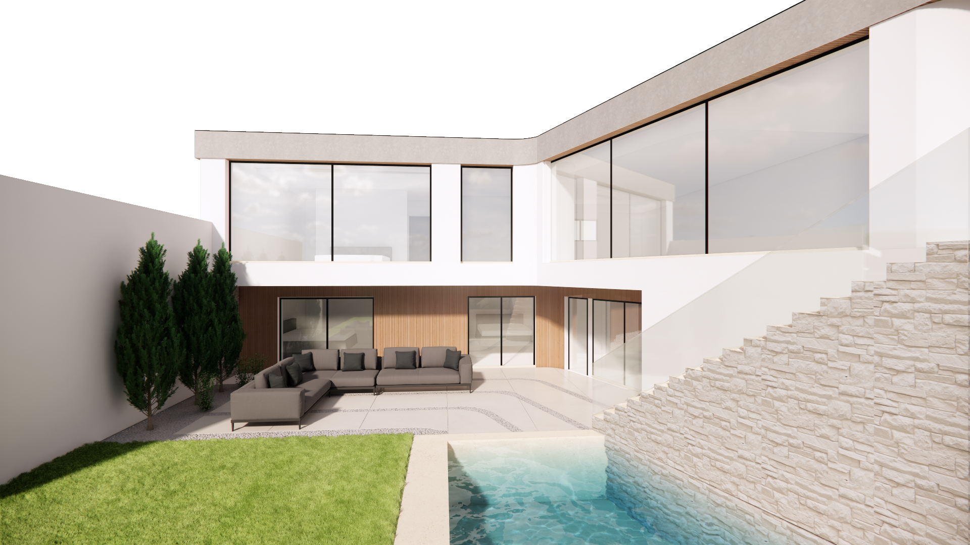 please add a sky and some atmosphere keep the rest of the arhcitecture