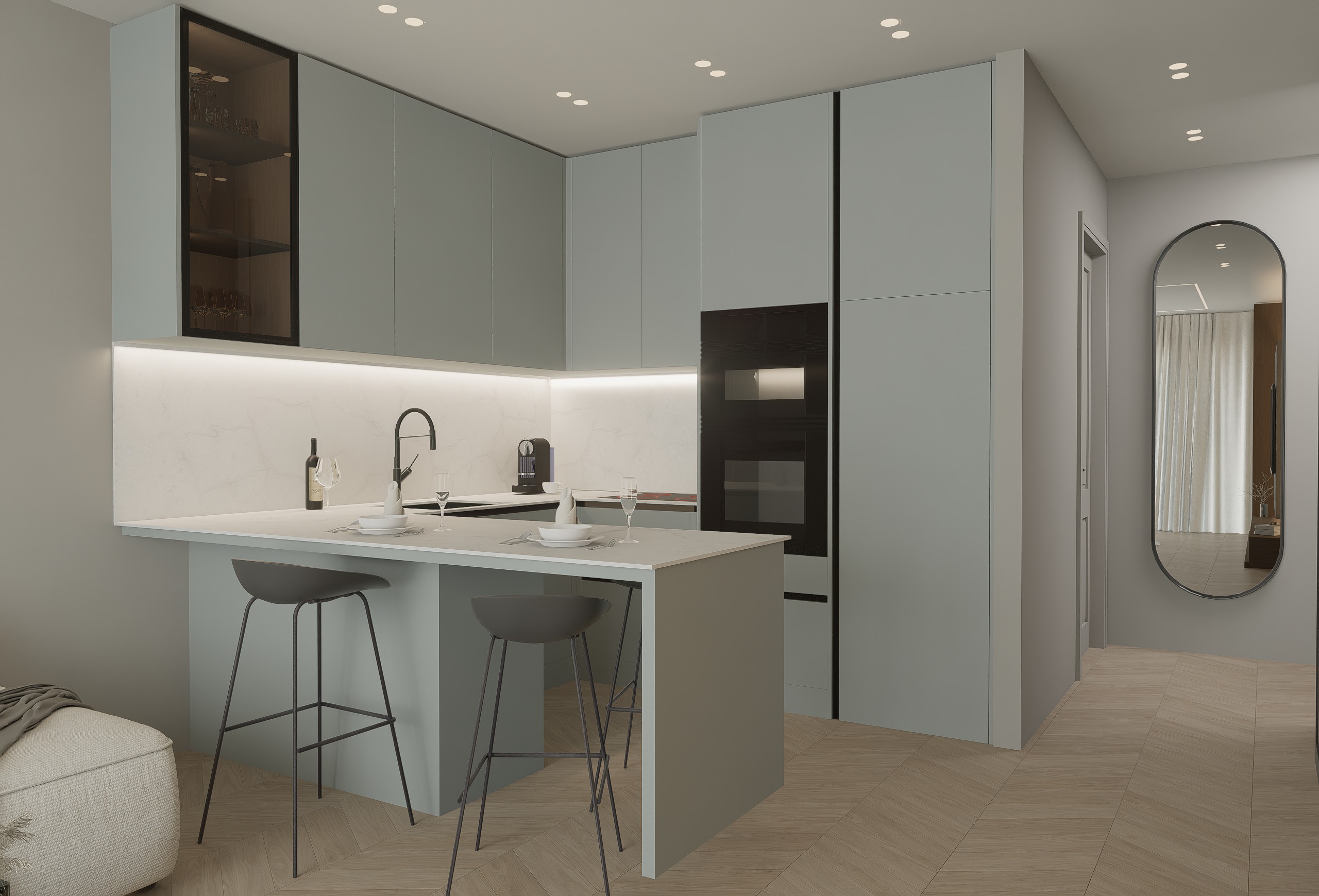 transform this render into an ultra realistic high end kitchen interior visualization while keeping the exact same layout cabinet configuration island design appliance placement walls flooring lighting positions and camera angle unchanged do not redesign anything apply the same sage grey green matte finish to all kitchen cabinetry exact same tone as previous renders the finish should be smooth matte lacquer clean soft and uniform no gloss no texture variation material consistency cabinetry sage grey green matte lacquer identical to previous angles countertop backsplash light warm white stone with very subtle veining quartz look flooring light oak herringbone matte natural grainappliances minimal black glass built in unitsfaucet matte blackglass cabinet slightly tinted glass with soft warm internal lightingenhance realism subtle reflections on matte cabinetry very soft not glossy realistic stone surface with fine veining and depthnatural variation in oak floor grainsoft shadowing under island and cabinetryambient occlusion for depthwarm glow inside glass cabinetlighting 3000k 3500k warm neutral lightingsoft ceiling spots with realistic falloffcontinuous under cabinet led strip soft and even balanced exposure no harsh contrastkeep the space minimal clean and calm no additional decor or changes render as a photorealistic architectural image ultra detailed materials premium modern kitchen look negative prompt do not change layout do not change design do not move elements do not change island proportions do not change camera angle no glossy cabinets no color deviation from sage tone no dark wood no oversaturation no clutter no unrealistic lighting no redesign