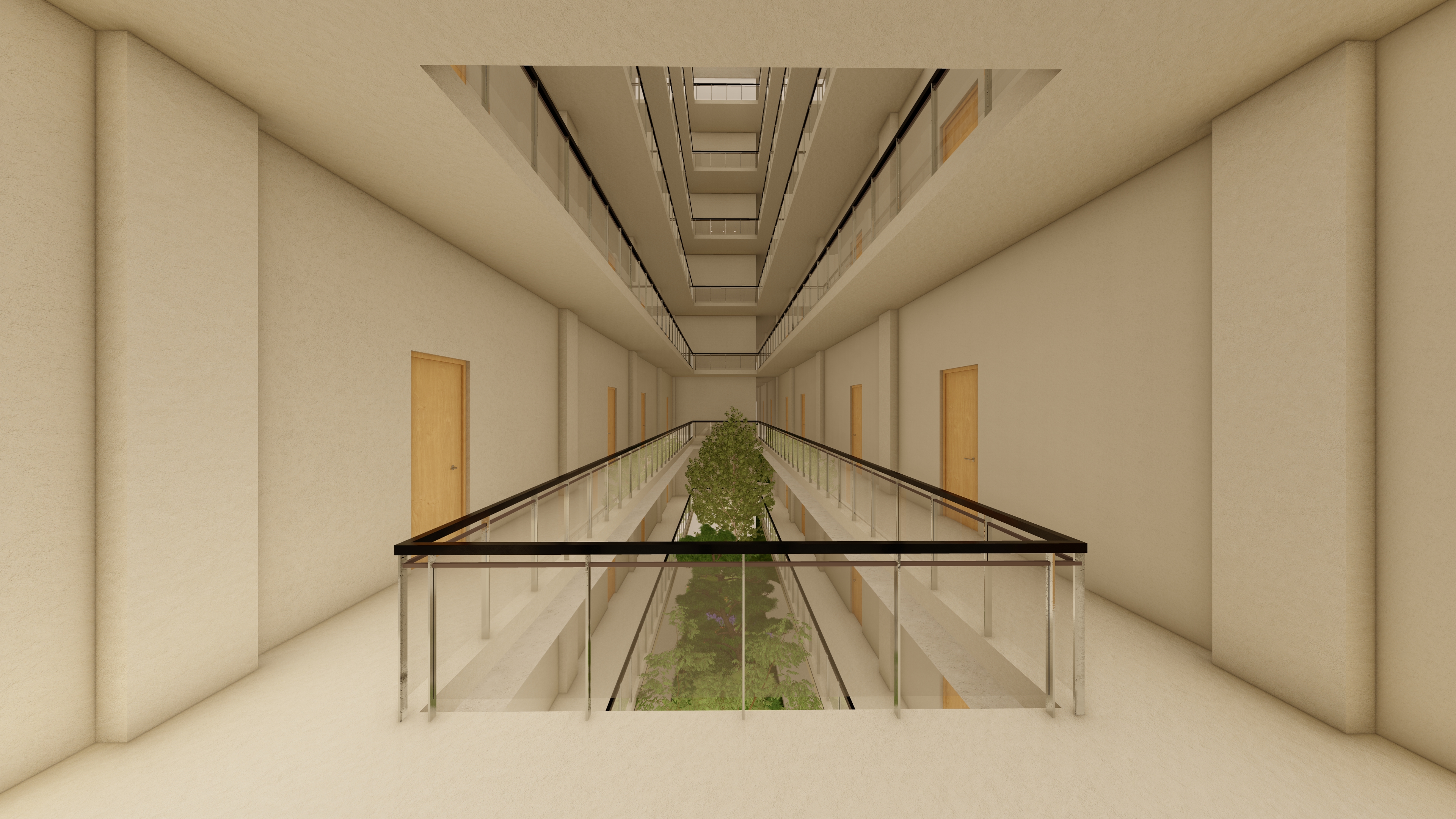 change and modify the materials in the existing photo to modern contemporary materials in warm gray tones and match the following for the walls and columns polished plaster in light greige for the floors 600x600mm porcelain tile in light grey beige match the walls and columns for the wooden doors natural wood in tanguile for the railings make the tempered glass reflective and the railings matte black for the elevator make it stainless steel make it cinematic photorealistic 4k resolution 16mm camera lens with artificial lighting suited for lobbies and sunset daylighting looks like a real estate photograph not a 3d render