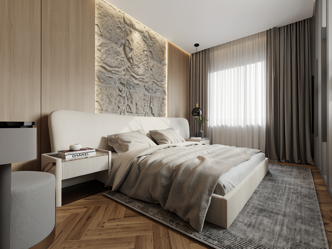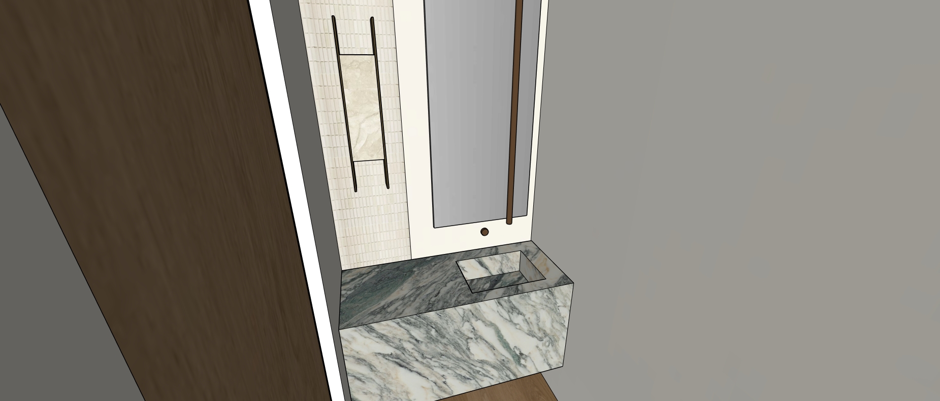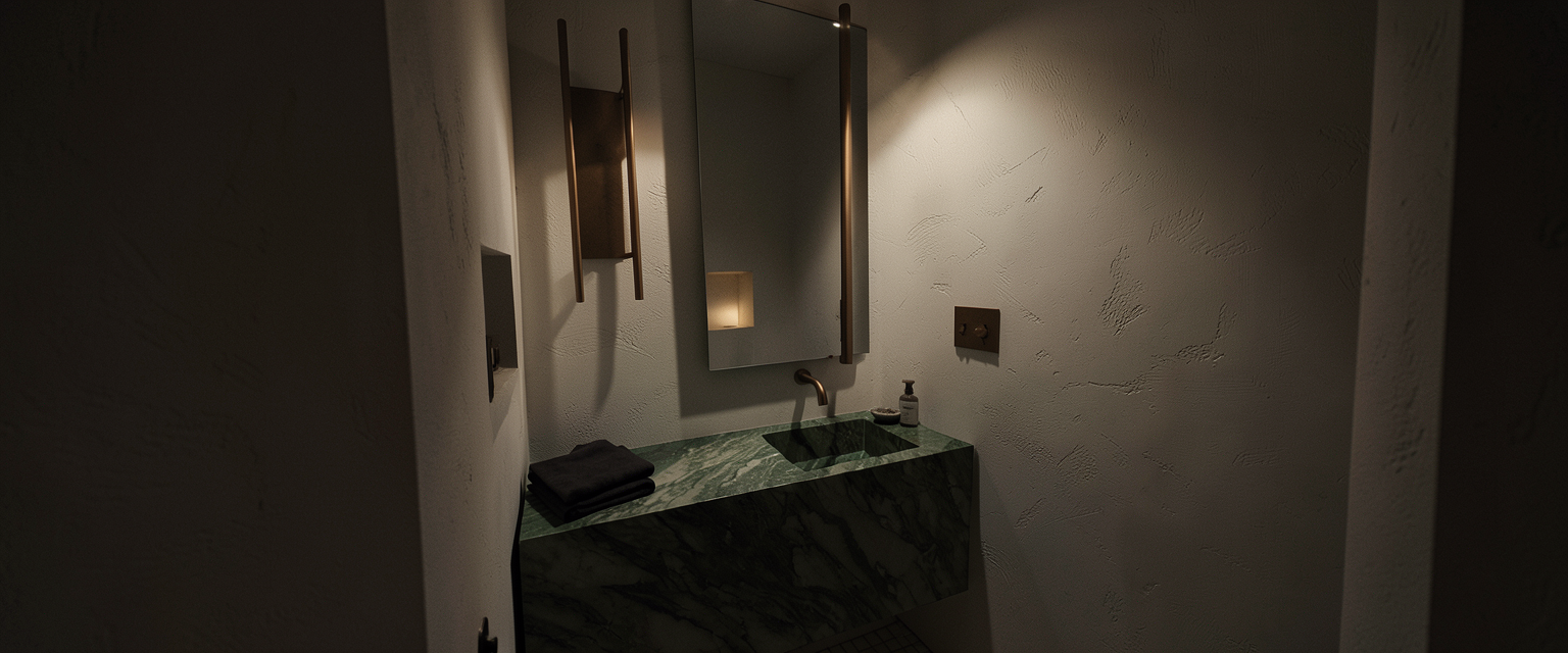 use the exact provided image geometry and camera angle do not redesign restage or change layout convert to photorealistic render only materials walls portola paint brooks roman clay warm creamy white matte visible plaster texture floor ann sacks salluto sticks mosaic bianco natural marble honed vanity green oasis marble bold green veining integrated sink faucet bronze ceiling mounted column style mirror vertical 24x54 minimal wall light warm sculptural sconce soft glow lighting moody high contrast one primary warm light source at wall sconce no overhead lighting strong shadow falloff slightly underexposed soft highlights only on stone and metal style photorealistic architectural digest cinematic no cgi look negative do not change design do not add objects do not restyle do not brighten scene do not widen view