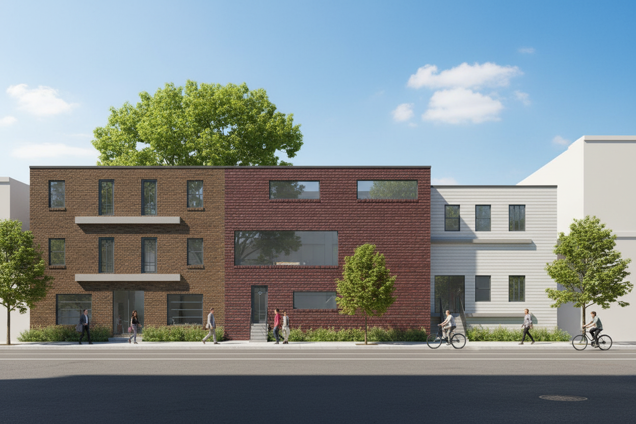 pen watercolor warm red brick soldier course rowlock course white siding trim round columns gutters dark bronze downspouts warm charcoal architectural asphalt roof shingles