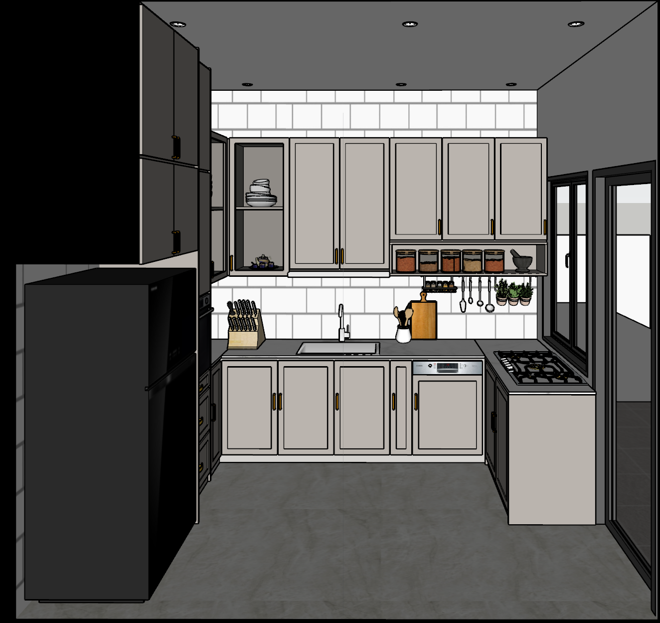 modernist interior shot warm kitchen with a lighter grey oak white marble countertops glossy white brick wall do not add rug there will be hood above the water tap but no need to be too obvious image must be16 9 aspect ratio on a sunny day make sure that the dish washer must be obvious no need to reflective on cabinet panels remove the board beside of the refrigerator architecture