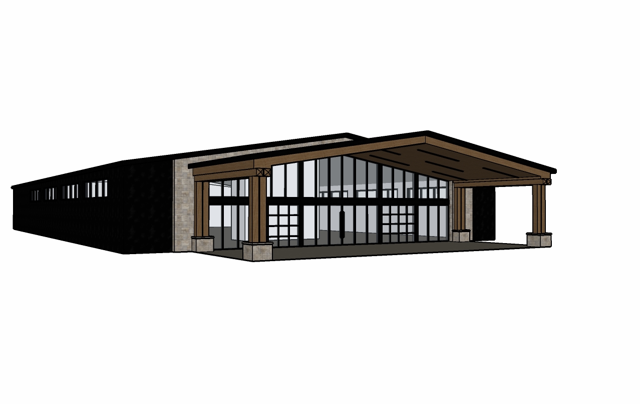 exterior shot maintain architecture and materials high quality render add landscape vintage cars inside of building lighint human scales