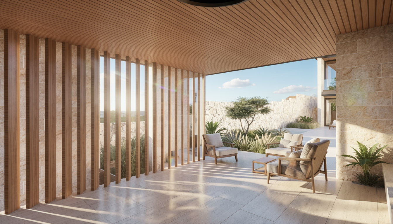 render a photorealistic 3d perspective of this house keep the current materials just enhance them split face limestone walls cream stone floors keep model geometry the same windows doors roof walls enhance the current materials and make the landscape nicer vegetation detailed shadows on cream textured limestone wall and a vibrant clear sky with a few clouds add slight lens flare slight atmospheric depth render in hyper realistic architectural visualization quality 8k resolution
