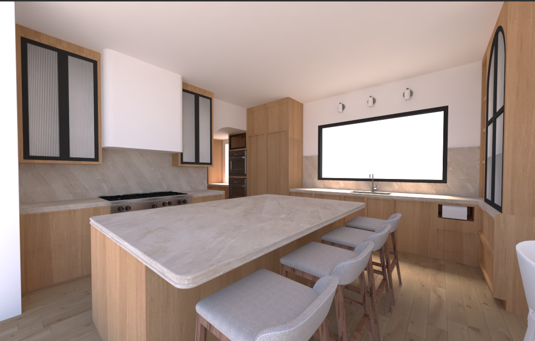 a modern kitchen interior with a warm and inviting atmosphere the central island is made of light beige marble reflecting natural light surrounded by high stools with soft gray upholstery the cabinetry is crafted from light oak wood giving a cozy feel countertops are a smooth cream toned stone the walls are painted in a soft white complementing the sleek black frames of the large window ambient lighting is provided by subtle recessed fixtures the hardwood floor adds further warmth with its light natural wood tone enhancing the serene minimalist design