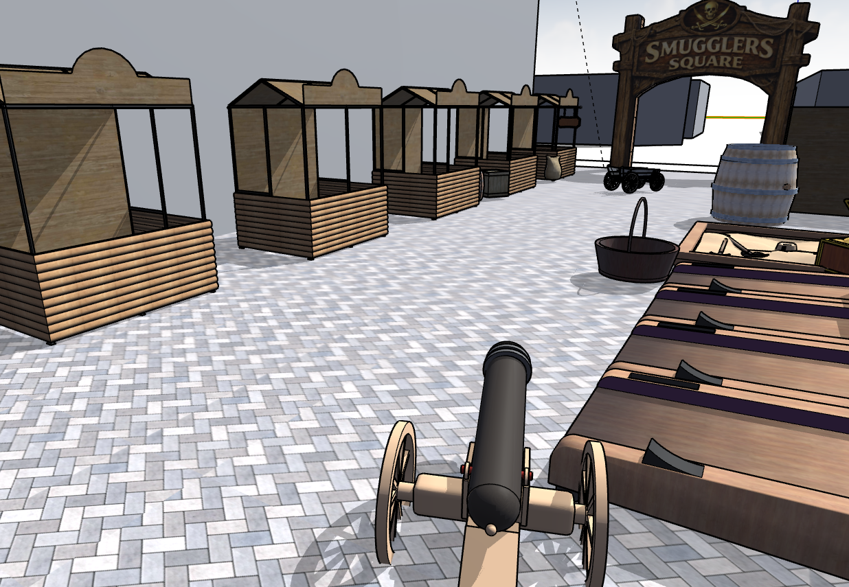 zaha hadid exterior shot ultra realistic architectural visualization of a pirate themed caribbean market area called smugglers square preserve the exact layout and camera perspective of the reference image a cannon shooting gallery game in the foreground wooden carnival game table on the right a row of small wooden vendor stalls along the left side and a large rustic wooden arch reading smugglers square in the background improve materials and realism weathered caribbean wood textures rope details fishing nets nautical props rum barrels crates lanterns and subtle pirate decor evening golden hour lighting with warm lanterns and string lights overhead realistic shadows high end architectural rendering quality clean stone pavement tropical coastal atmosphere style pinterest worthy caribbean market design authentic nautical theme realistic materials cinematic lighting professional architectural visualization important maintain the same stall positions arch placement cannon game location and overall composition as the reference image do not add people characters fantasy elements or change the structure architecture