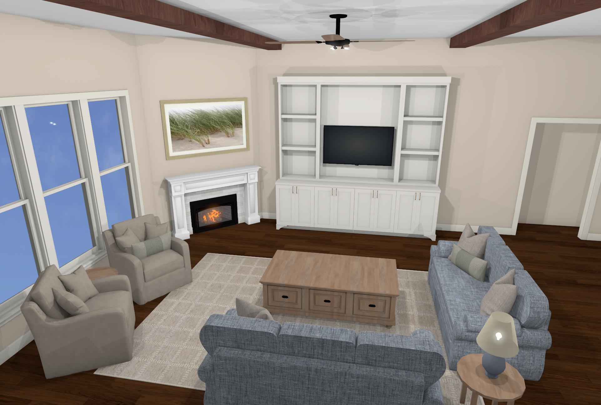 make the view from the windows a first story backyard grass and some trees add decor to shelves in built in keep wall paint color the same