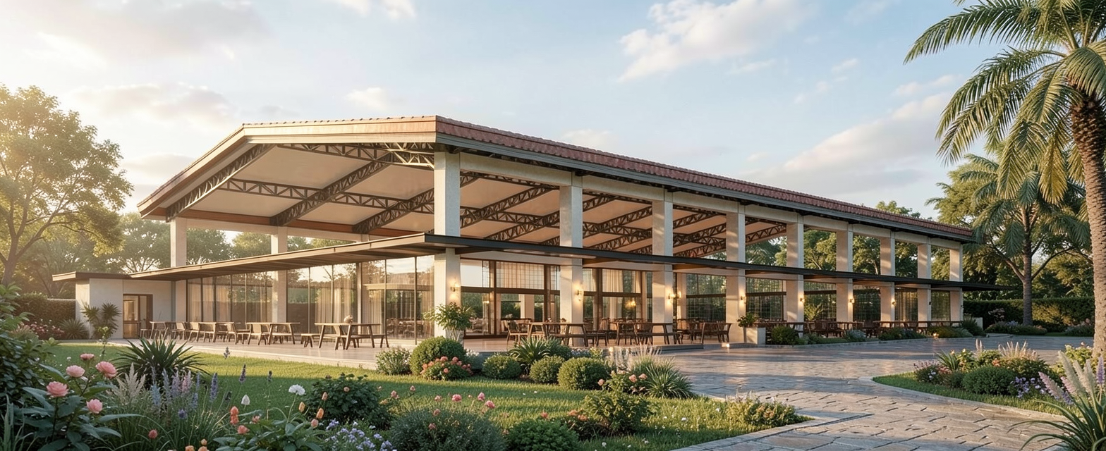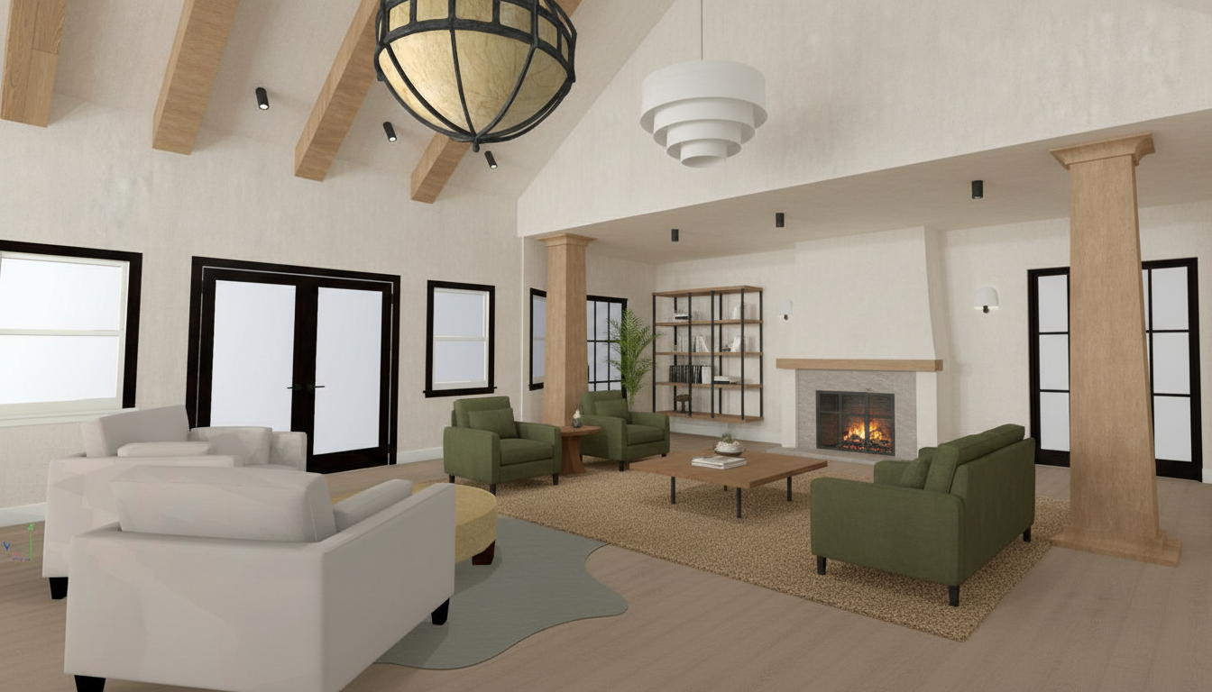 industrial style church lobby all doors are modern flat panel brown wood with gray trim concrete floors white ceiling medium gray walls text saying l1fe groups in dark orange paint underneath the text are clear wall holders with paper pamphlets in them restroom text is also done in dark orange paint vertically all text fonts are clean and modern add warm recessed lighting in the ceiling white rectangles are tv displays that show worship graphics doors have no door handles