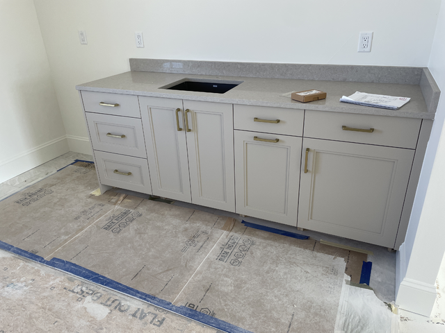 do not change the cabinets in any way preserve the exact cabinet colors materials finishes dimensions door and drawer styles hardware spacing alignment and all geometry exactly as shown do not alter the countertop shape backsplash appliances flooring lighting fixtures or wall structure only remove the construction materials clutter and mess from the scene clean the room and make it look finished and staged add a few simple tasteful home accessories appropriate for the style of the space but do not add or remove any furniture windows or architectural elements maintain the original lighting direction and realism enhance clarity and polish the photo while keeping the cabinetry and room design completely unchanged do not alter the lighting to keep the cabinet colors as they are in the image add a gold faucet to the sink put a stacked washer dryer on the left stage for a laundry room add flooring