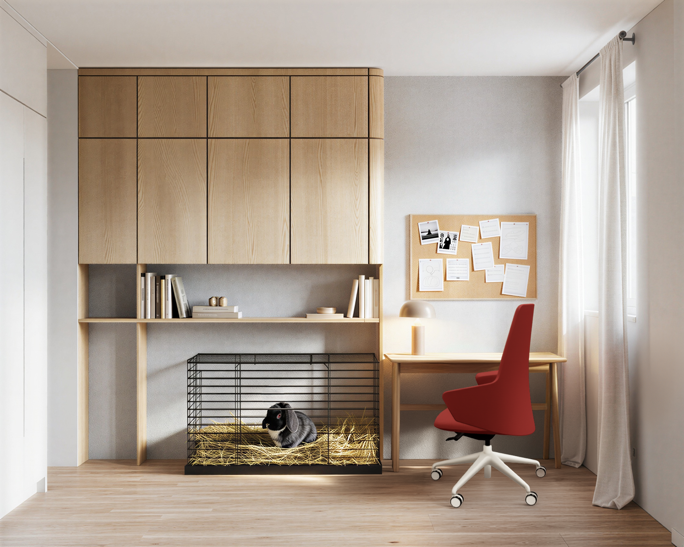 use the provided image strictly as the base image for composition camera angle room layout furniture placement proportions and architecture do not change the layout objects or geometry modify only the material of the red office chair replace the current smooth surface with a realistic upholstered fabric texture the chair should remain the same shape color and position but the material should clearly appear as woven textile upholstery with subtle fabric grain soft light interaction and natural stitching details typical of modern fabric office chairs preserve the exact same color tone of the chair warm red but make the fabric slightly matte and tactile to emphasize the textile quality do not modify any other furniture materials lighting objects or decorations the desk cork board cabinets cage with the rabbit shelves books walls curtains and floor must remain exactly the same the result should be a highly realistic interior render with the only change being the chair s material upgraded to fabric upholstery