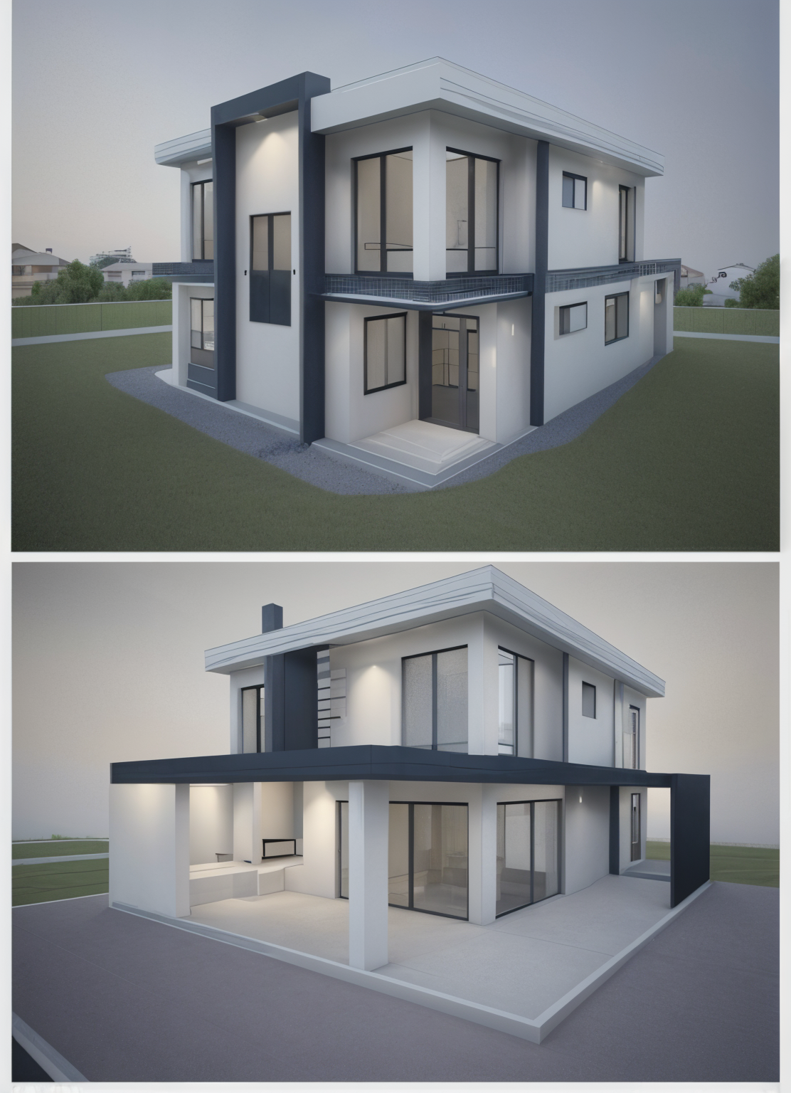constructivism exterior shot a modern minimalistic two story house with a sleek geometric design the exterior walls are painted in crisp white complemented by bold black accents on the roofline and window frames large floor to ceiling windows provide an open airy feel with deep grey for the window and door trims the house is surrounded by a smooth dark grey concrete patio conveying an elegant contrast the atmosphere is serene and contemporary set against a clear blue sky with soft sunlight gently illuminating the structure casting subtle elongated shadows on the ground architecture