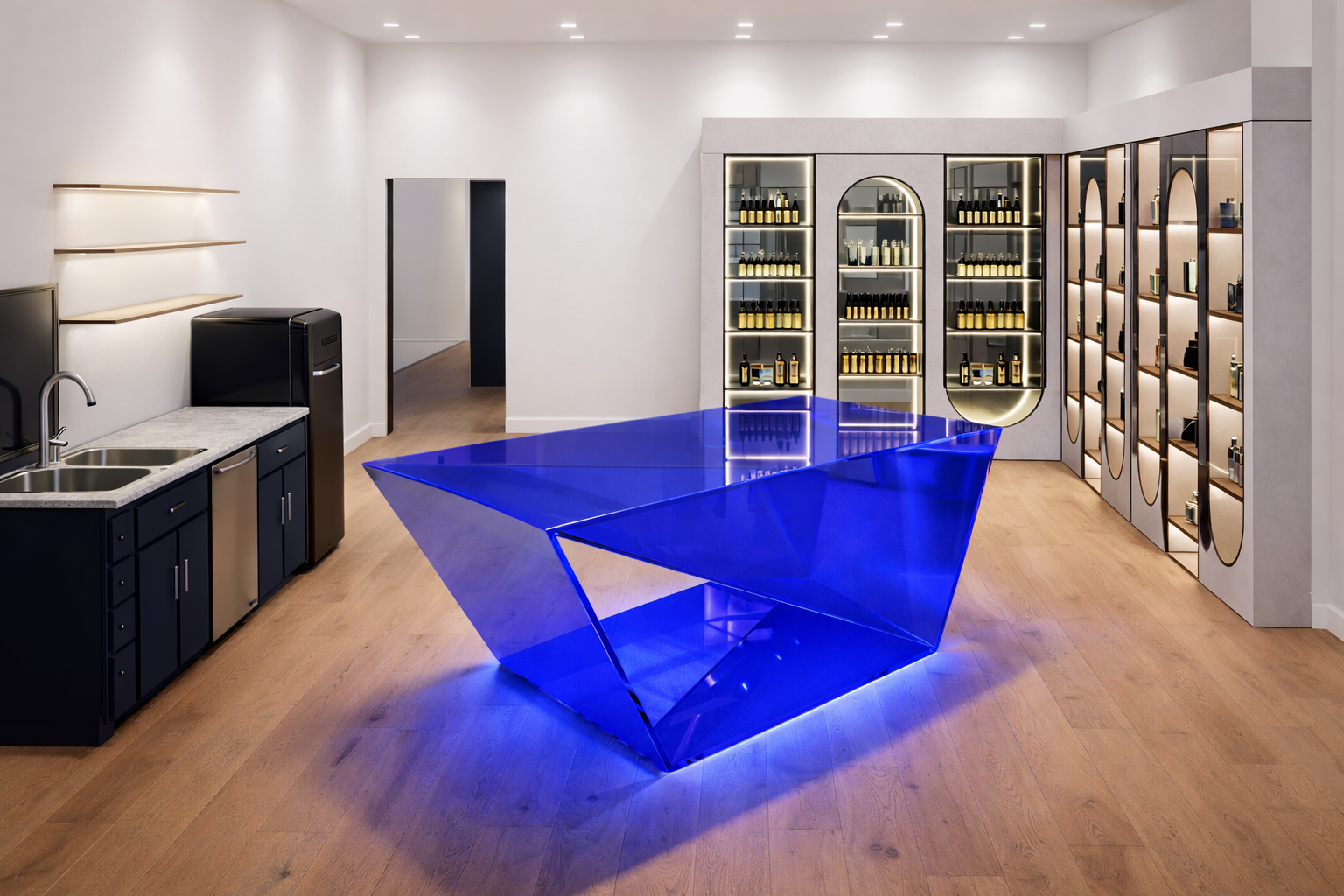 interior shot remove the blue acrylic furniture and add an island with stools on one side make it a storage island on the other side and use a reflective stainless steel finish the orientation of the island should be parallel to the right side shelving