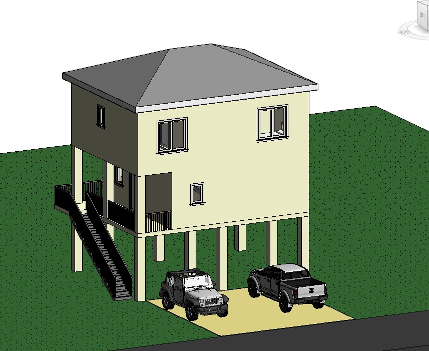 the home is located in at tropical setting with tropical shrubs and palm trees nearby the house is a pale yellow and the trim and facia are white the stair railings are white with a dark wood handrail the window trim is white the roof is a light colored metal roof
