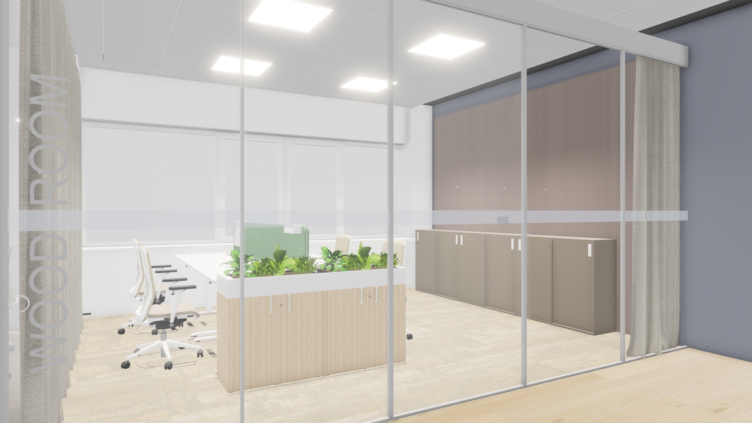 make it look photorealistic keep original colors and finishes make it look like a workplace for 4 people add 2 sitting people by the desks add the view of a plain field behind the windows cieling is armstrong plates keep the color of the walls keep the structure of the windows in the back wall all 4 workplaces are by the desks in the center