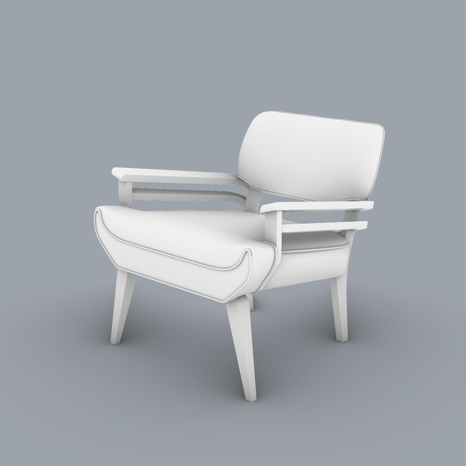 render a mid century modern armchair in a luxurious setting the chair should have rich brown linen upholstery with a polished white oak wood frame position the chair on a dark rich mahogany floor with a soft warm ambient light direct the light towards the front of the chair set the atmosphere to a cozy and inviting late afternoon with a soft golden glow filtering through sheer ivory curtains at the left side