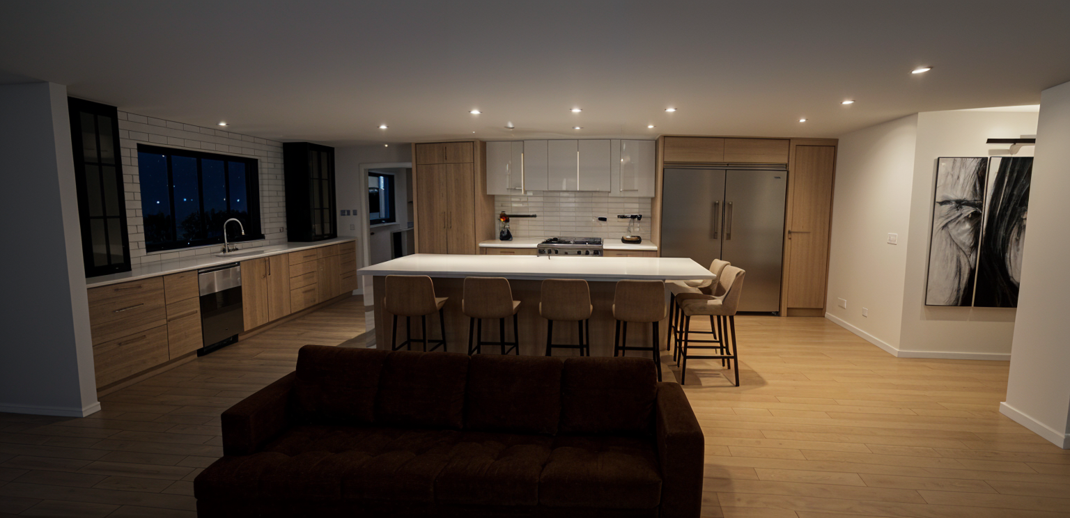 show this home in a photorealistic rendering keep the exact architectural details nighttime outside add recessed lighting in the ceiling