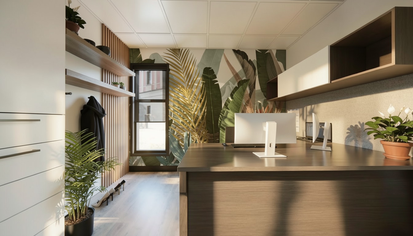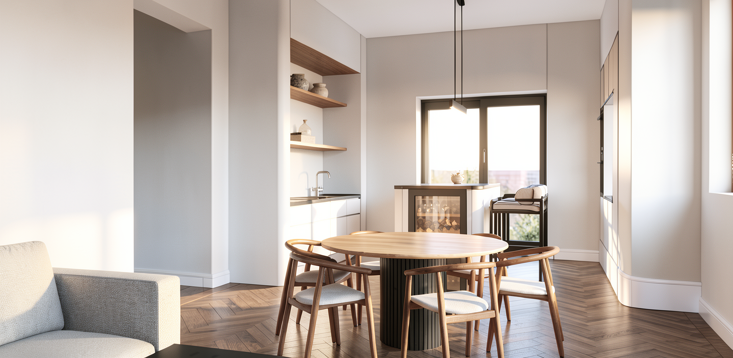 preserve the exact furniture geometry proportions cabinet layout and door divisions do not redesign or move any elements materials cabinet doors and drawer fronts egger u250 pm taupe grey matte laminate countertop and interior of the tall display cabinet egger h1344 natural sherman oak black aluminium frame around the glass showcase clear glass shelves inside the showcase furniture is a floating wall cabinet with soft warm led lighting under the cabinet and integrated spotlight inside the tall glass display cabinet environment modern minimalist living room wall light neutral plaster wall behind the furniture natural oak wooden floor lighting soft natural daylight combined with warm led accent lighting style high end interior visualization ultra photorealistic realistic wood texture realistic laminate material soft shadows global illumination 4k render
