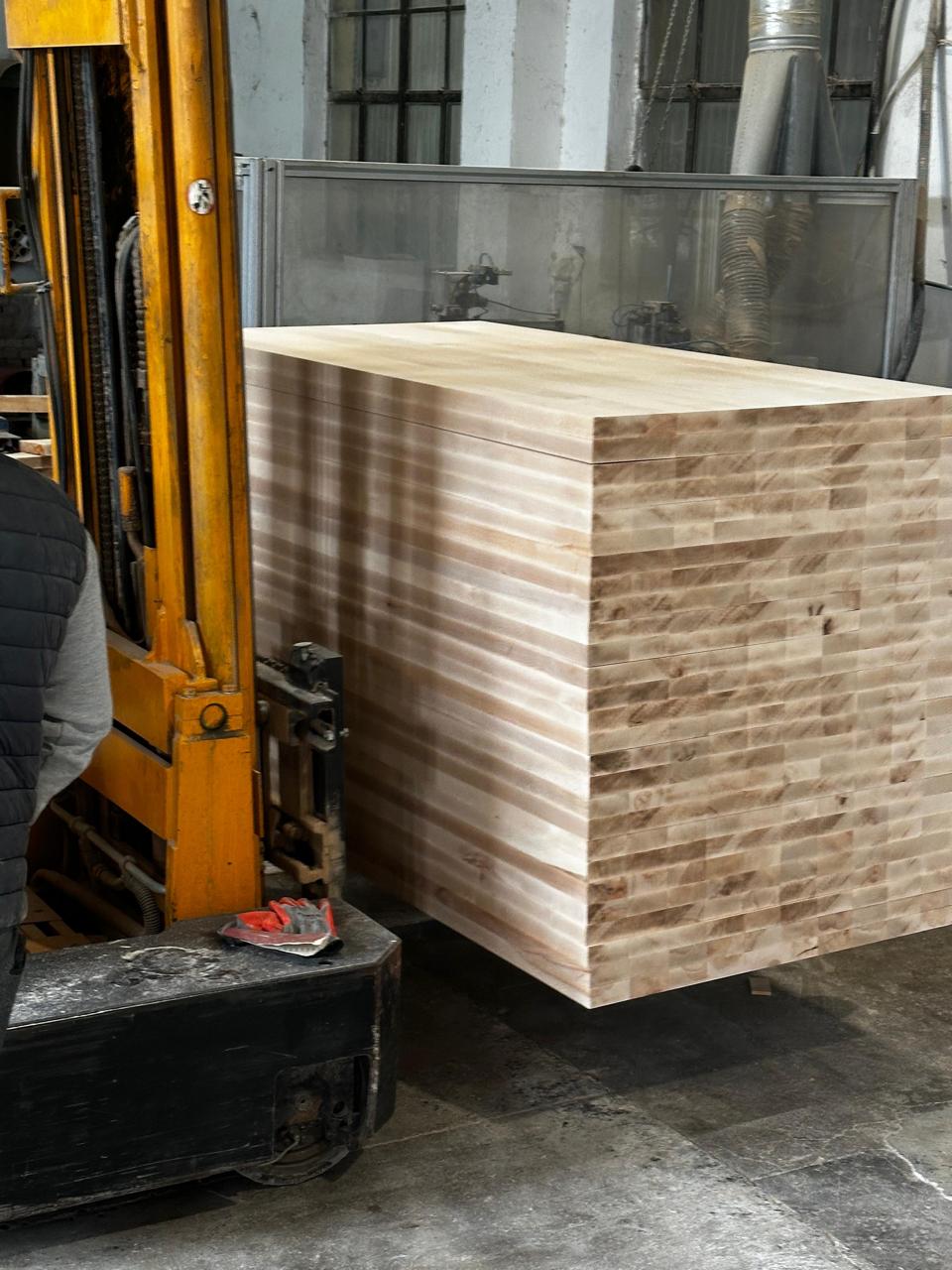 edit this image to enhance realism and composition without changing the subject or structure crop tightly around the wooden block so it becomes the dominant element in the frame reduce visibility of the forklift by cropping or subtly darkening it clean and simplify the background by softening details and reducing visual noise maintain the original materials and proportions exactly as they are enhance wood tones to appear warmer and richer increase contrast slightly while preserving natural lighting reduce highlights and soften shadows for a more cinematic look keep natural imperfections in the wood surface avoid any artificial or overly perfect textures maintain a high end architectural photography aesthetic minimal calm and controlled composition