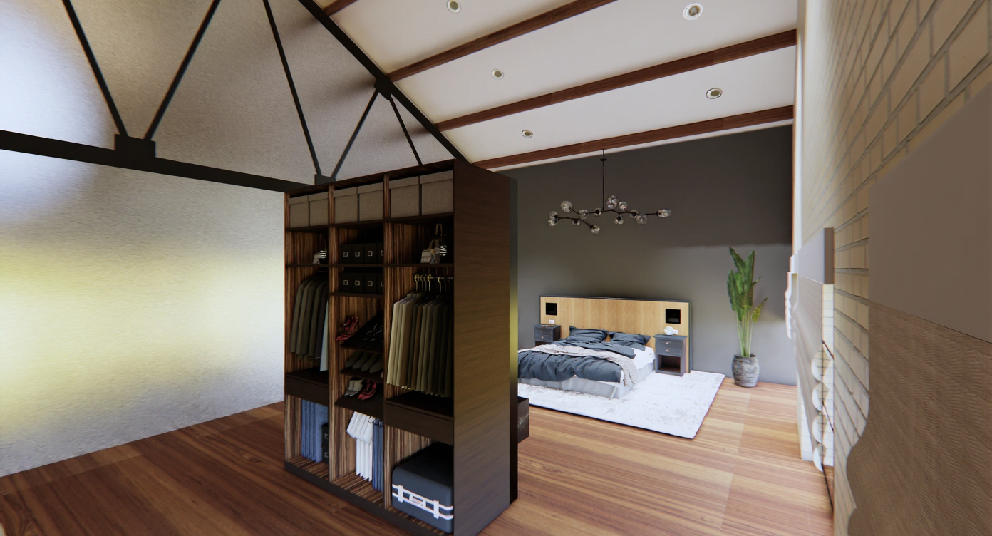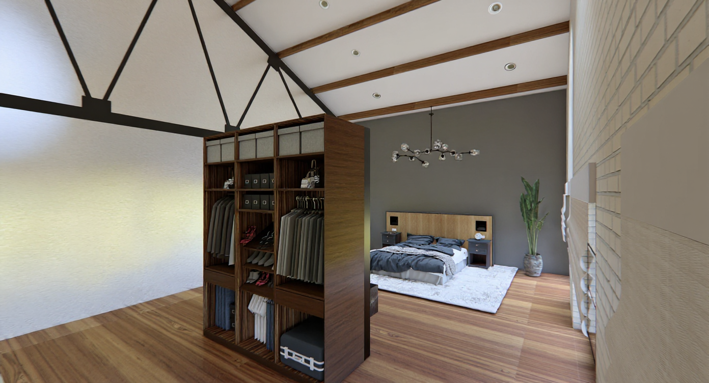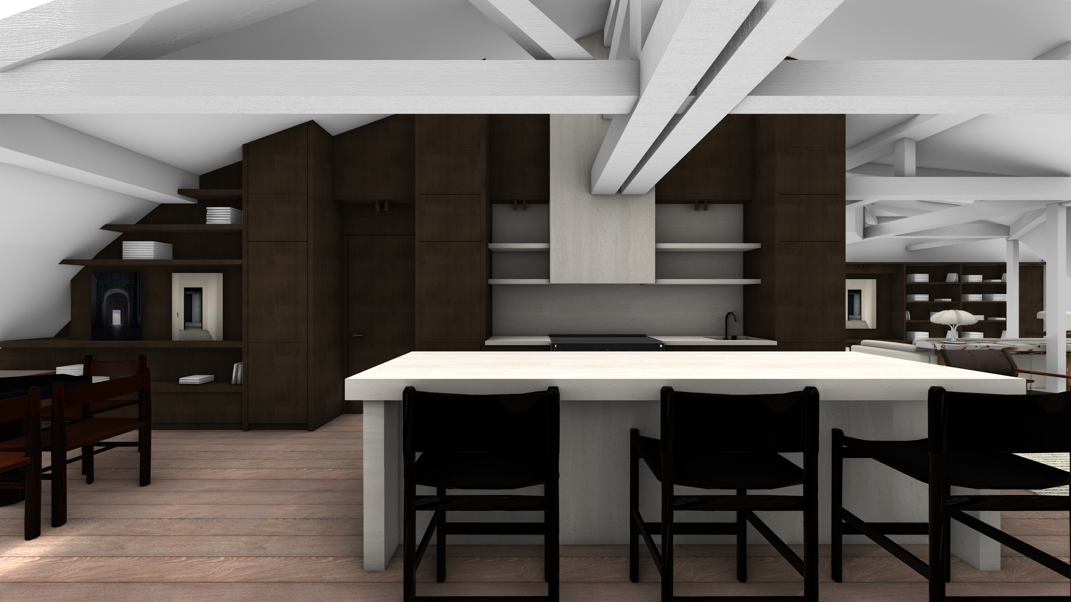enhance this 3d image without changing the framing perspective camera angle volumes or layout of the scene keep exactly the same materials in the same locations without inventing or altering any textures colors or finishes add continuous subtle led strips under all the shelves the kitchen shelves in the foreground the bookshelf shelves in the back of the room the leds should emit a soft even realistic glow make the image bright clear and natural emphasizing the daylight coming from the visible windows strengthen light bounces and natural diffusion while fully respecting the original materials wood stone metal etc maintain the same camera position angle depth of field and proportions improve only the rendering quality sharpness realism refined shadows correct reflections and overall light coherence goal produce a highly realistic luminous elegant 3d image that remains fully faithful to the provided scene