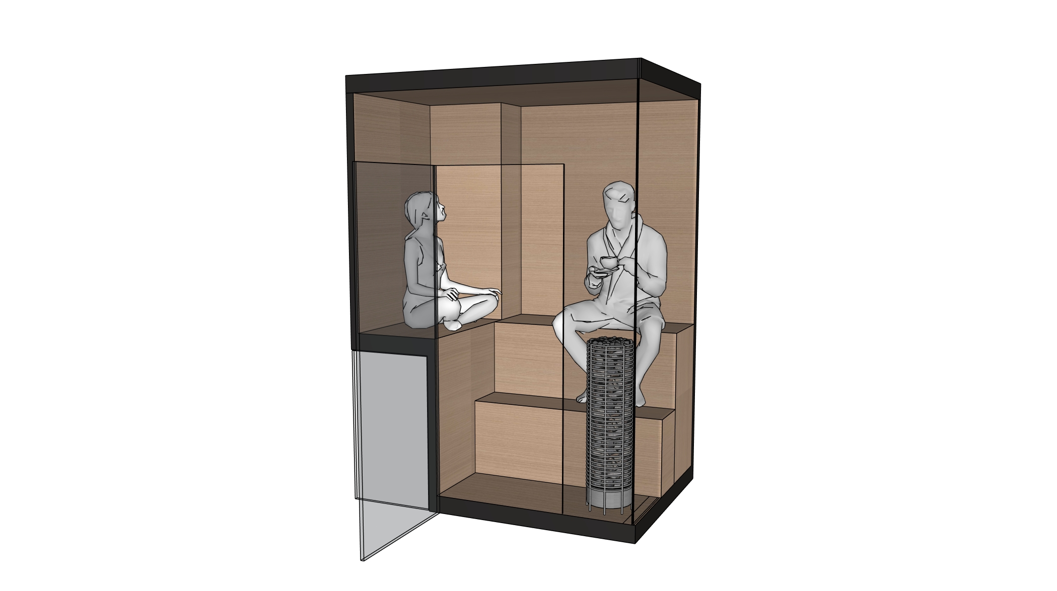 use the uploaded model image as the exact design and geometry reference render this sauna concept as a high end realistic interior exterior architectural visualization preserve the exact geometry proportions bench layout heater position glass walls door position ceiling height and overall spatial arrangement exactly as shown do not redesign the sauna do not change the layout do not add windows decorations accessories or extra architectural elements material specification interior walls and ceiling clad in brushed thermo alder horizontal wood boards 120 mm wide warm medium brown thermo alder tone refined premium brushed wood texture minimal elegant scandinavian wellness character glass specification front and side glazing in very dark grey tinted glass strongly toned smoked glass appearance clean premium glass surfaces with subtle reflections slim dark framing only lighting indirect led lighting integrated along the ceiling perimeter light directed softly downward along the walls warm white led glow subtle premium ambient atmosphere no visible light source only indirect illumination effect sauna specification total sauna height 250 cm compact two person sauna layout preserve the cylindrical stone heater exactly in the shown position maintain the intimate premium architectural feel of the concept visual style ultra realistic architectural render premium wellness design clean neutral background no people no towels no plants no additional objects focus on wood texture tinted glass lighting and realistic material depth soft shadows balanced contrast elegant composition