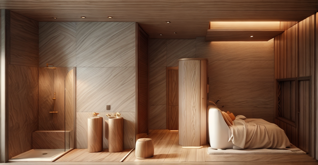 the upper part of the house where is door in beige facade the lower part in brown facades along the edge with the ground in light colored terraplast add a black railing with vertical bars on the stairs and in the extension of the terrace