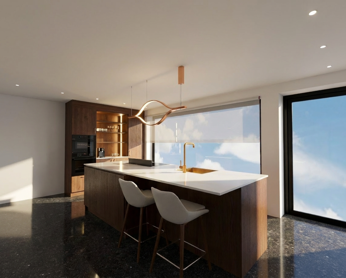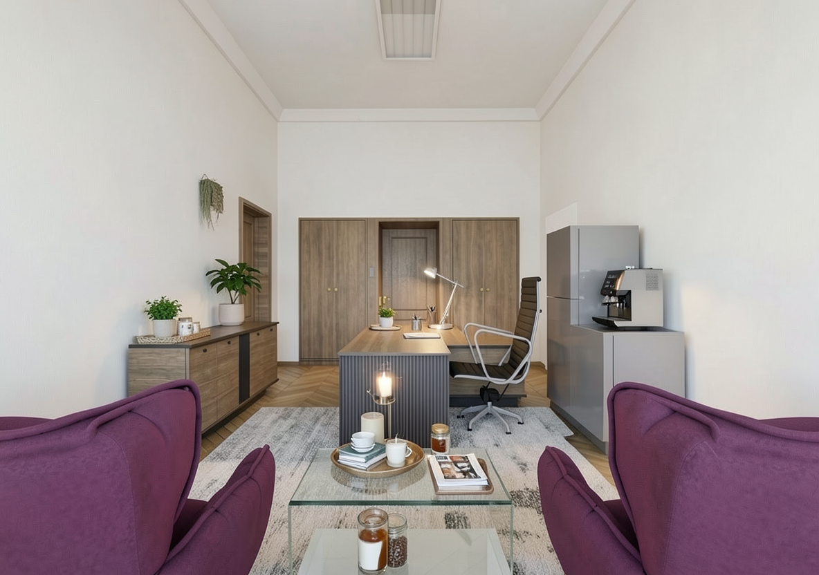 render senyata mungkin dengan panel warna krim polos bukan kayu dan dinding warna off white lantai vinyl krim dan panel di belakanag hapus jadi dinding polos pegangan tangga warna hitam ada lampu indirect di atas pegangan tangga dan lampu sorot kecil di tengah atas pajangan plafon putih tempat pajangan bolong tembus tidak ada panel