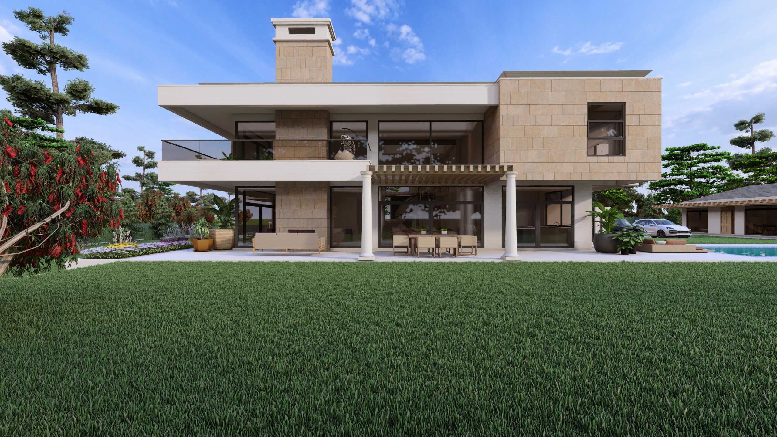 modern two story house with a clean minimalist design the exterior features light beige stone walls and large glass windows reflecting the sunlight the roofline is flat and contemporary surrounding the house is a lush vibrant garden with deep green grass and various trees with red flowers a clear blue sky with a few scattered clouds creates a bright cheerful atmosphere in the background a crystal clear swimming pool is visible the patio area is under a pergola with white columns featuring cozy outdoor furniture in natural wood tones the overall mood is serene and inviting depicting a sunny day