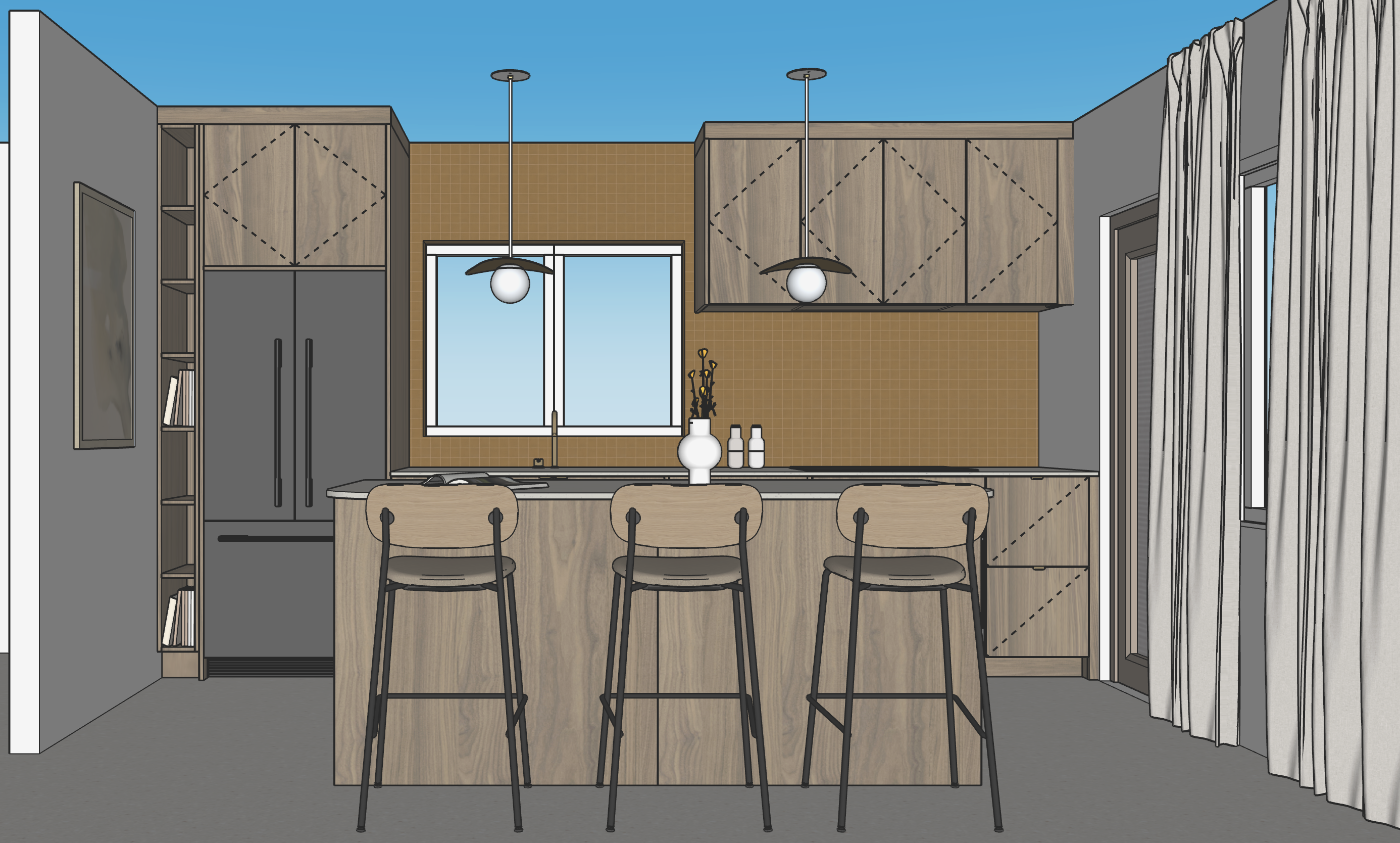 a modern luxurious kitchen with a serene and sophisticated atmosphere the room features sleek grey oak cabinetry with flutted travertine curved cabinets and a large island centerpiece made natural traavertine romano the walls are clad in a soft cashmere hue with panelling complementing the cabinetry appliances are seamlessly integrated adding a touch of contrast overhead lighting is warm and ambient creating a cozy yet refined ambiance the flooring is parquet enhancing the airy feel of the space sparse greenery adds a hint of freshness while maintaining the minimalistic and clean design outdoor light from the right hand side window view is of luxury villa style