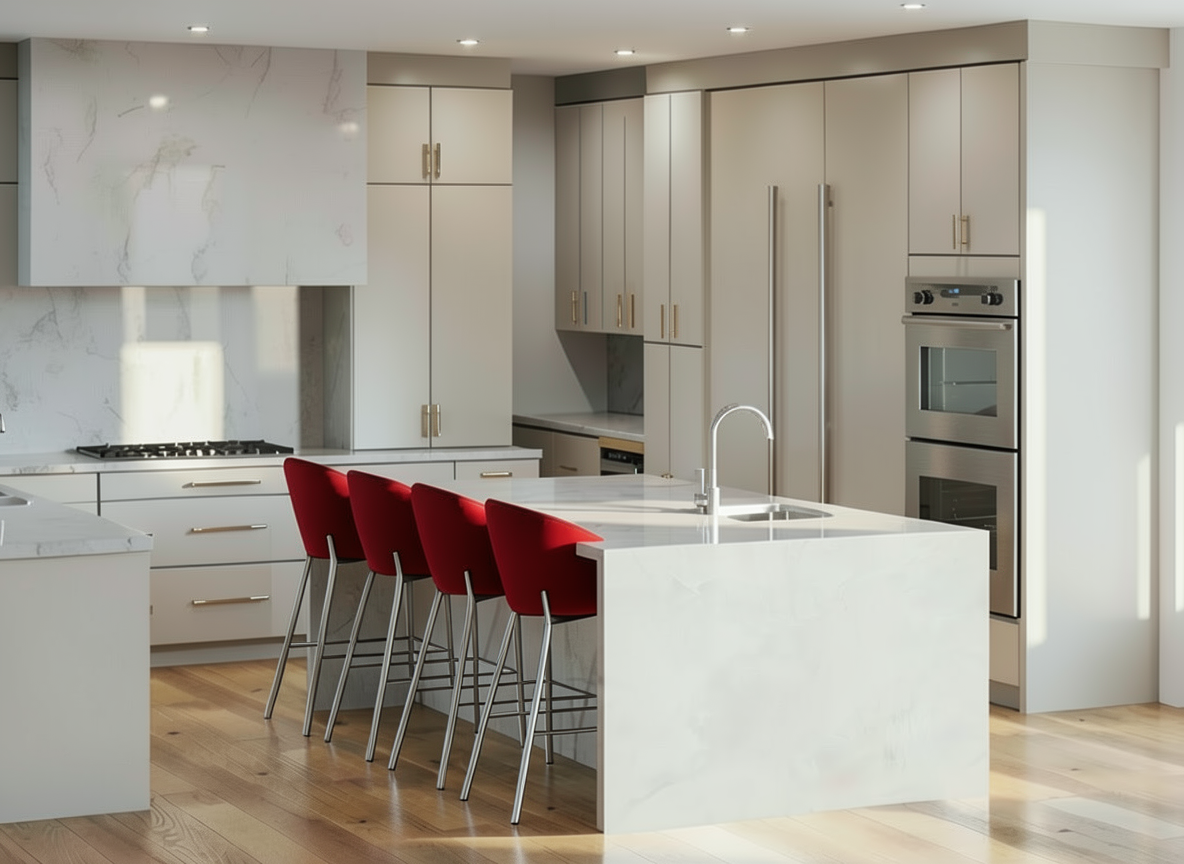 keep all the materials the same and lay out only change the counters backsplash hood and island counter a white concrete material