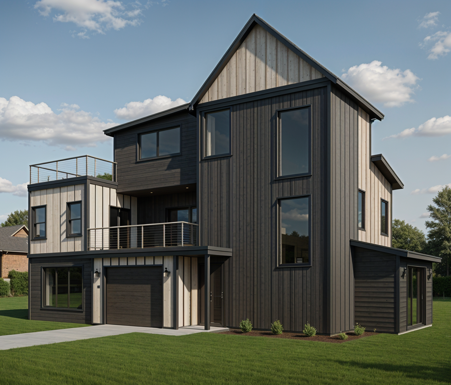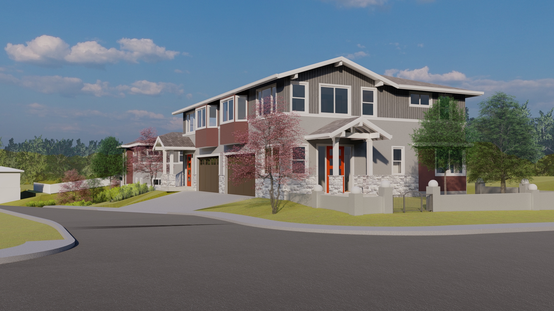 enhance the scene with have photorealistic materials and keeping the original colors the atmosphere should be serene and inviting with a bright blue sky filled with soft fluffy clouds add low lying landscape native shrubs in green areas