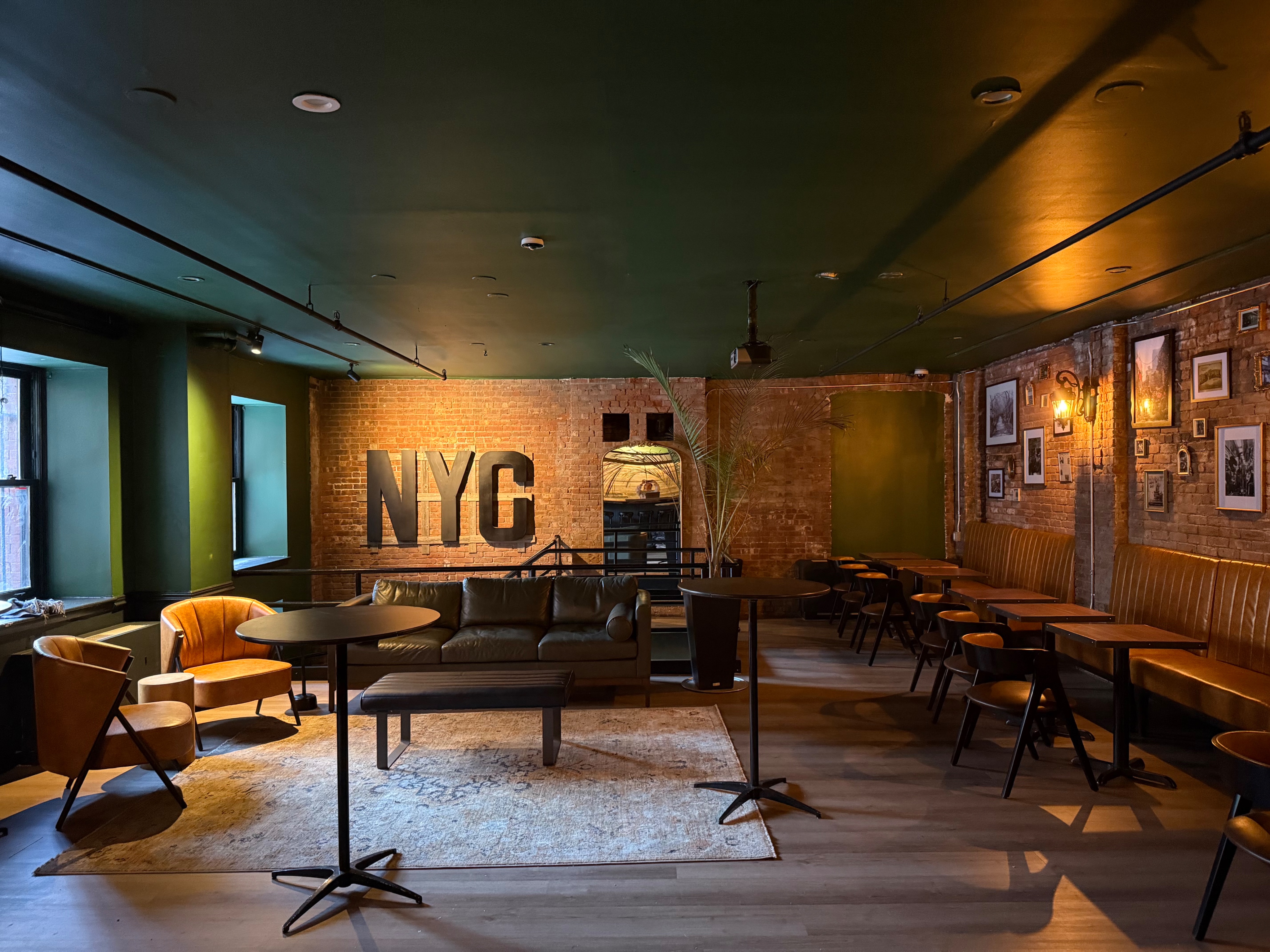 render a perspective interior view of a moody nyc cocktail lounge bar the space features exposed warm red brick walls densely covered in an eclectic gallery arrangement of framed black and white and color photographs of varying sizes hung salon style from floor to ceiling across every wall surface a large bold nyc metal letter sign is mounted on the brick feature wall the ceiling is painted deep forest green with black industrial pipe conduit running across it the floors are light natural oak hardwood along the right wall runs a long continuous tufted brown leather banquette with small square wooden tables and dark bistro chairs tucked tightly against it no tables floating in the open floor the left side of the room features a lounge seating arrangement with a dark leather sofa low coffee table and amber velvet accent chairs on a worn vintage rug the entire space is filled with lush tropical houseplants towering areca palms large fiddle leaf figs trailing pothos and clustered snake plants placed in every corner along walls and beside the banquette creating a dense indoor jungle feel the lighting is warm amber and dim with vintage wall sconces mounted between the framed photographs casting a golden glow on the brick the atmosphere is intimate dark and layered like a well worn new york speakeasy buried in foliage and memories photorealistic architectural interior rendering wide angle perspective shot cinematic lighting 8k