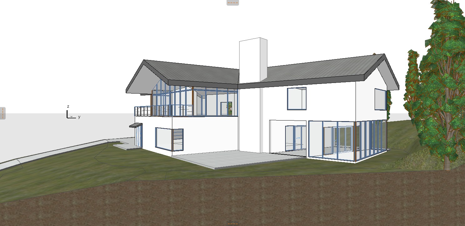 exterior shot render this perspective of the same house in the reference image use the same materials same vegetation same atmosphere do not change the form or materials of the building and pavement be careful to not obstruct the concrete pavement