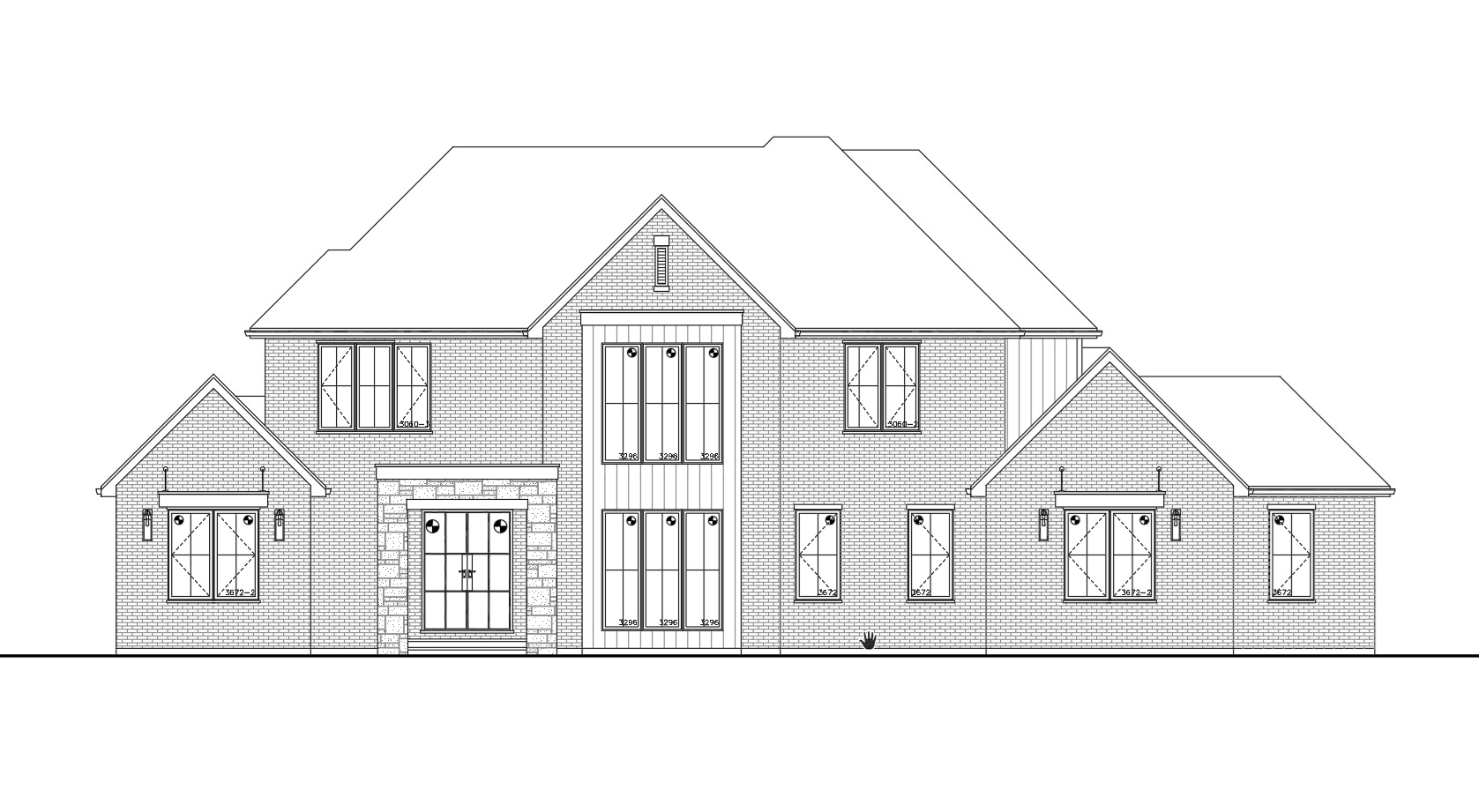 white brick natural limestone at front entrance black shingles roof black fascia and gutters white soffit black window trims charcoal vertical siding make it look realistic sunny day with shadows