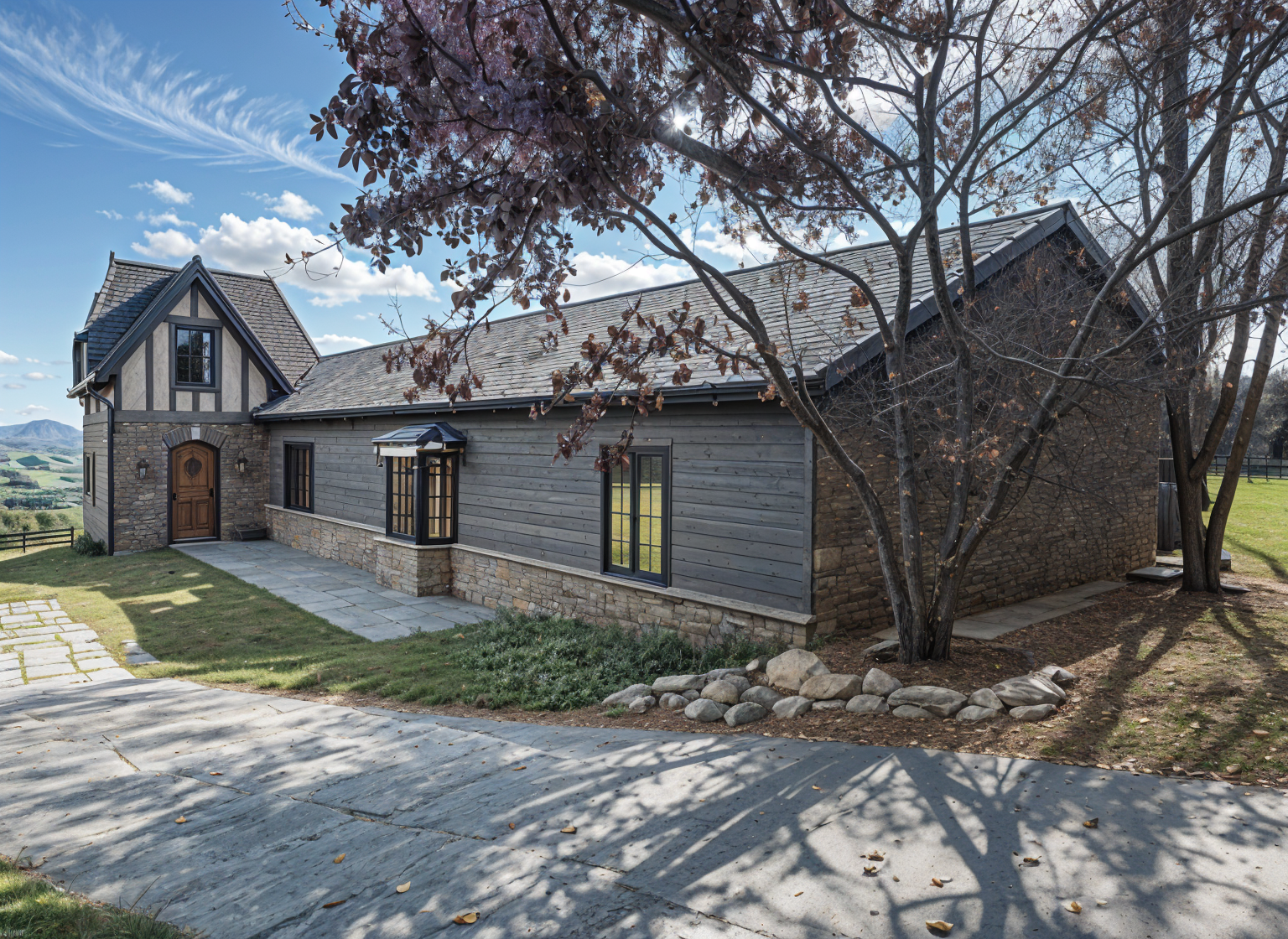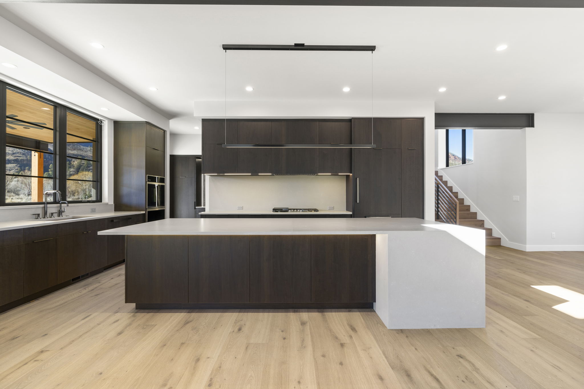 photorealistic rendering contemporary furniture style like restoration hardware need four kitchen stools under the overhang no dining furniture