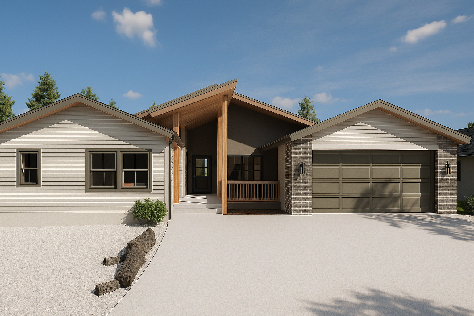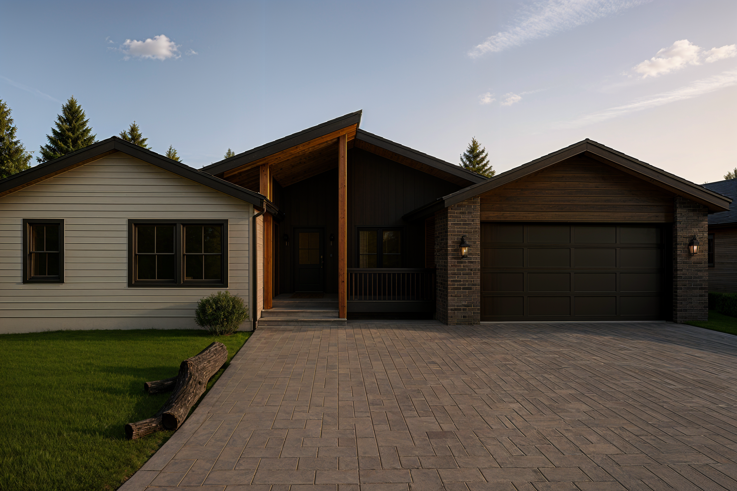keep everything the same add some extra lighting in the middle at the dark portion so you can see the board and batton siding and brighten the windows with interior lighting enhance details enough to showcase the existing materials