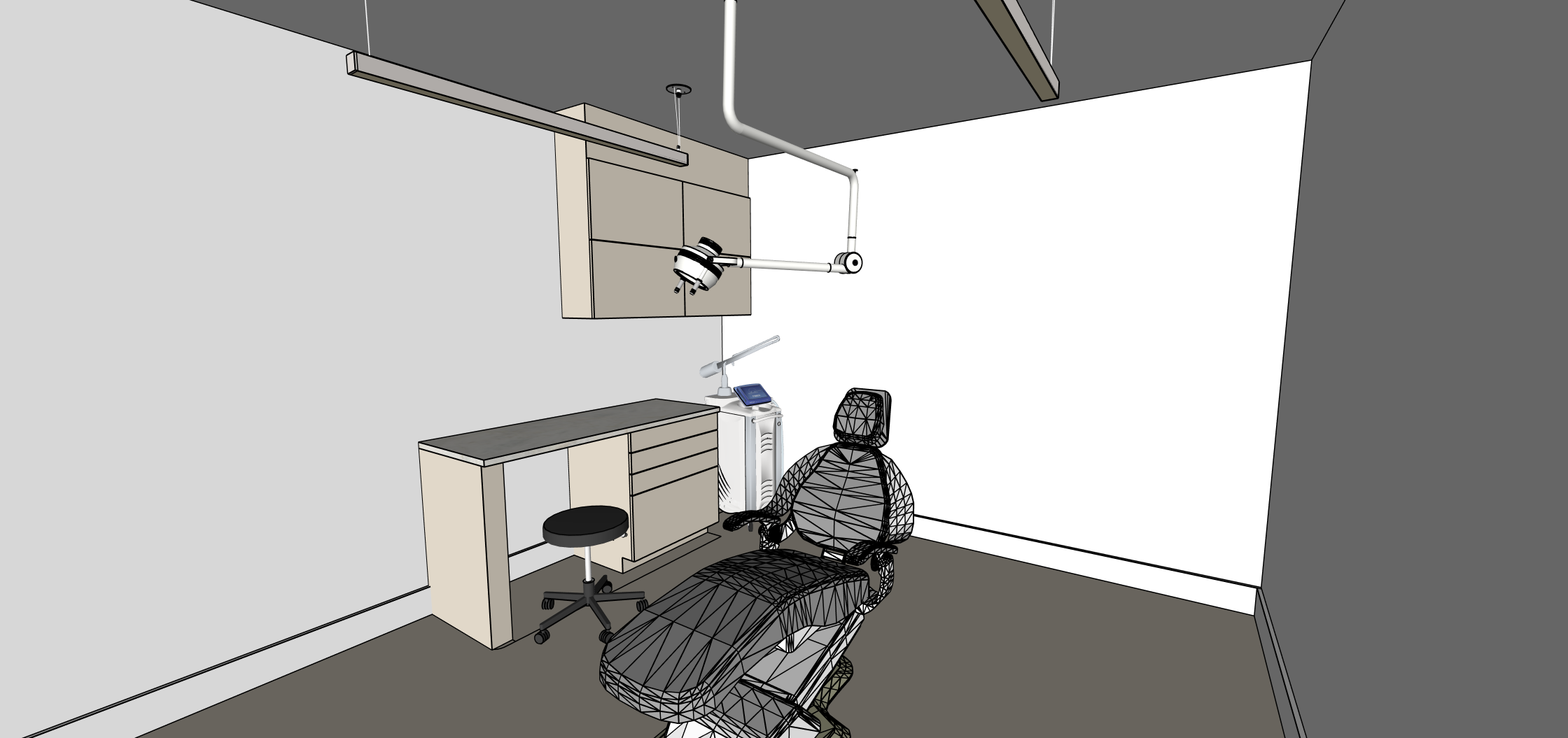 render a modern dermatologist exam room with 3000k linear lighting the walls are a warm calming white the ceiling is a sophisticated white with linear direct indirect lighting and exam room fixture use a clean light beige for the cabinetry and desk the exam chair is sleek black leather with subtle metallic accents the stool is black with chrome details a bright white lamp hangs from above casting a gentle glow the atmosphere is serene professional and welcoming