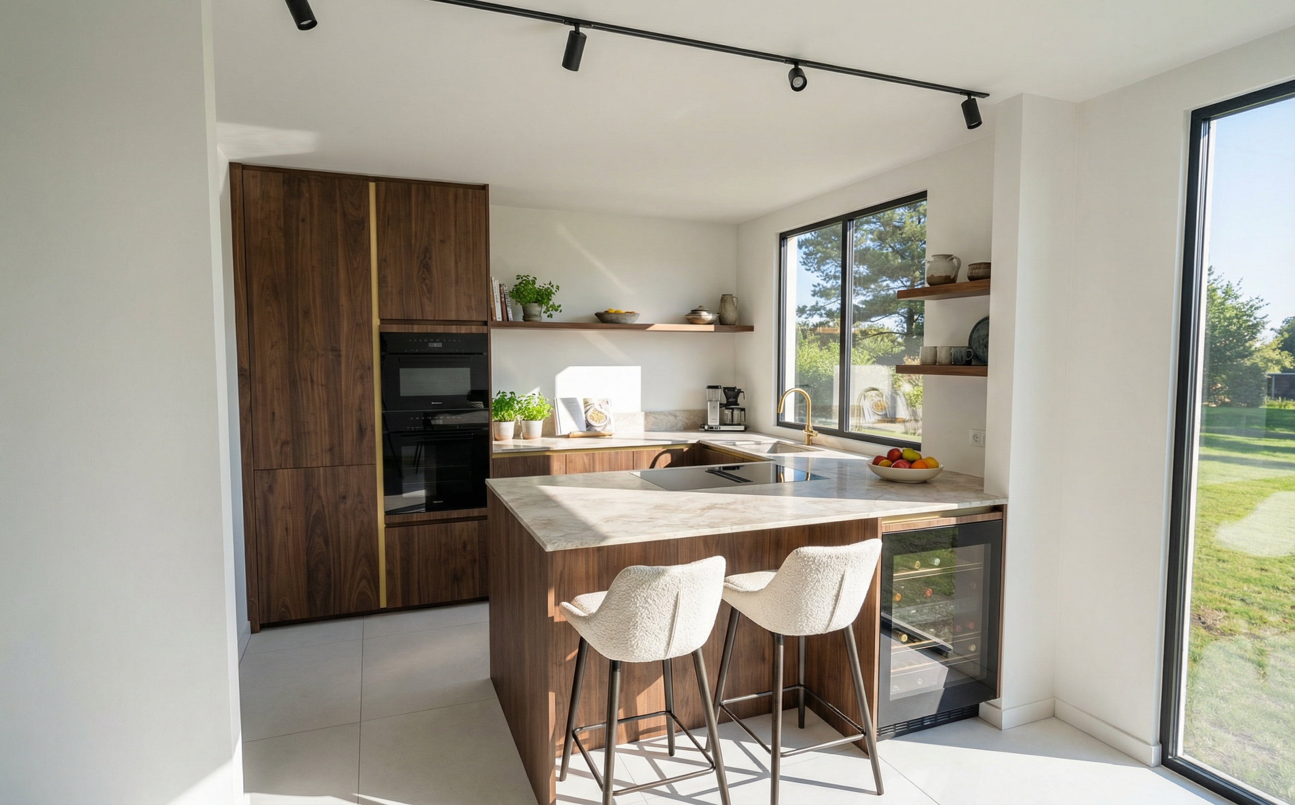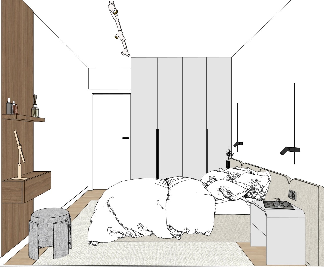 illumination in the interior as on a cloudy day transform the input interior design photo into a hyper realistic architectural visualization of a contemporary modern interior preserve exact geometry layout proportions and material intent from the original design lighting create soft overcast daylight atmosphere similar to a cloudy rainy day without visible rain with diffused natural light entering maintain balanced contrast no harsh shadows no overexposure materials textures enhance material realism micro details surface imperfections soft reflections accurate roughness physically correct light response emphasize textures wood grain fabric weave concrete metal and matte finishes high micro contrast and tactile depth rendering style ultra photorealistic architectural visualization cinematic quality natural color grading neutral tones soft highlights realistic global illumination physically based rendering high dynamic range premium interior photography style camera composition wide angle architectural lens natural perspective eye level viewpoint deep focus sharp details across the frame natural framing no distortion atmosphere calm elegant contemporary premium residential mood clean minimal refined without visual noise output 8k resolution ultra detailed noise free crisp edges professional architectural rendering quality white sockets do not add any led lighting straight ahead on the left side is a white door with a frame szafa jest kolorze bia ym ciany s bia e puf jest w kolorze jasnoszarym ze struktur splotu dodaj w czone o wietlenie w kinkietach negative prompts no rain droplets no lens flares no fog no haze no bloom no motion blur no cartoon no stylization no oversharpening no artificial glow no unrealistic reflections no distortion no clutter no led lighting no window