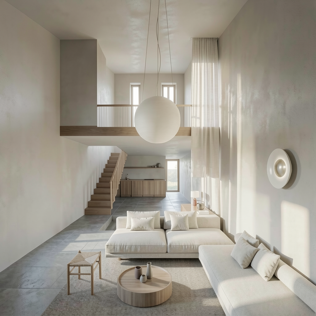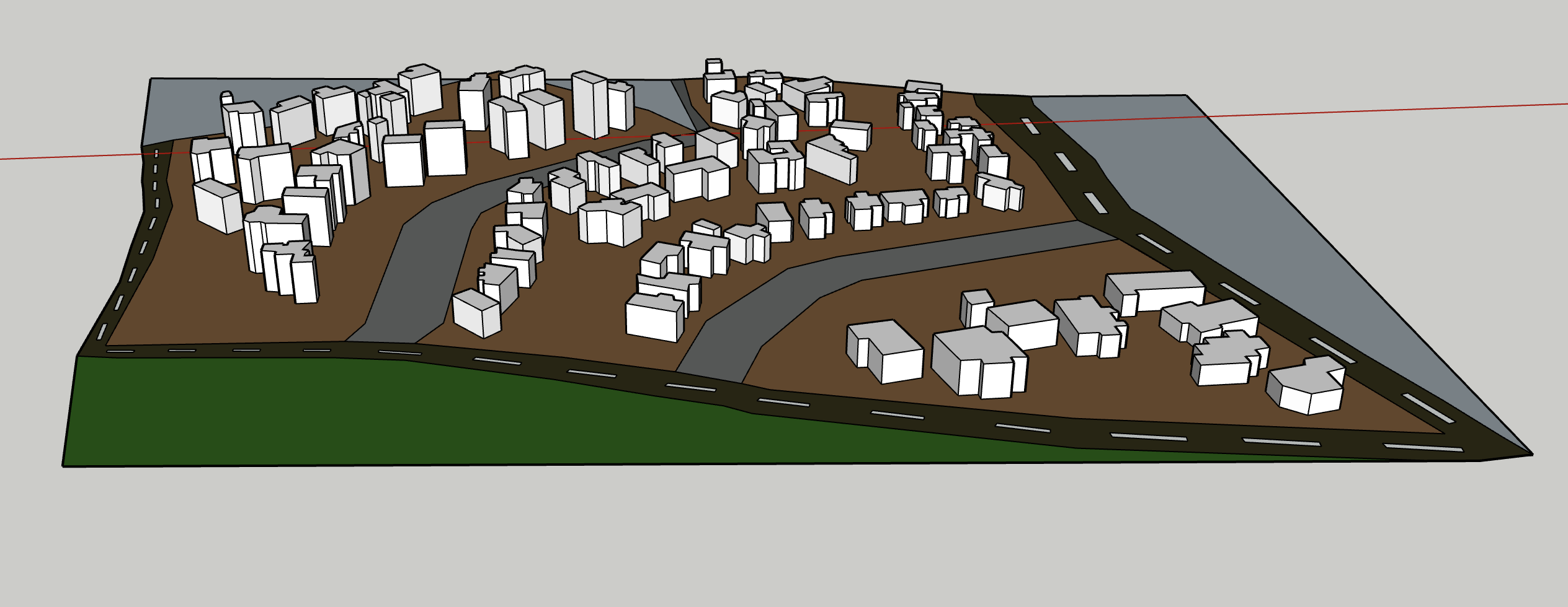 modernist exterior shot render a vibrant urban landscape on rolling hills use warm earthy tones like terracotta and burnt sienna for the land the buildings should be modern with a sleek white finish that contrasts with the surroundings the roads are winding with deep charcoal gray lined with bold white markings the atmosphere is serene and slightly overcast with soft diffused lighting creating a cozy and inviting ambiance the atmosphere should be bright and clear evoking a sense of tranquility and balance this is a newly introduced road designed to establish a clear internal access structure within the development the area in front of the road is designated as a coastal restoration zone while both sides are allocated as residential zones architecture