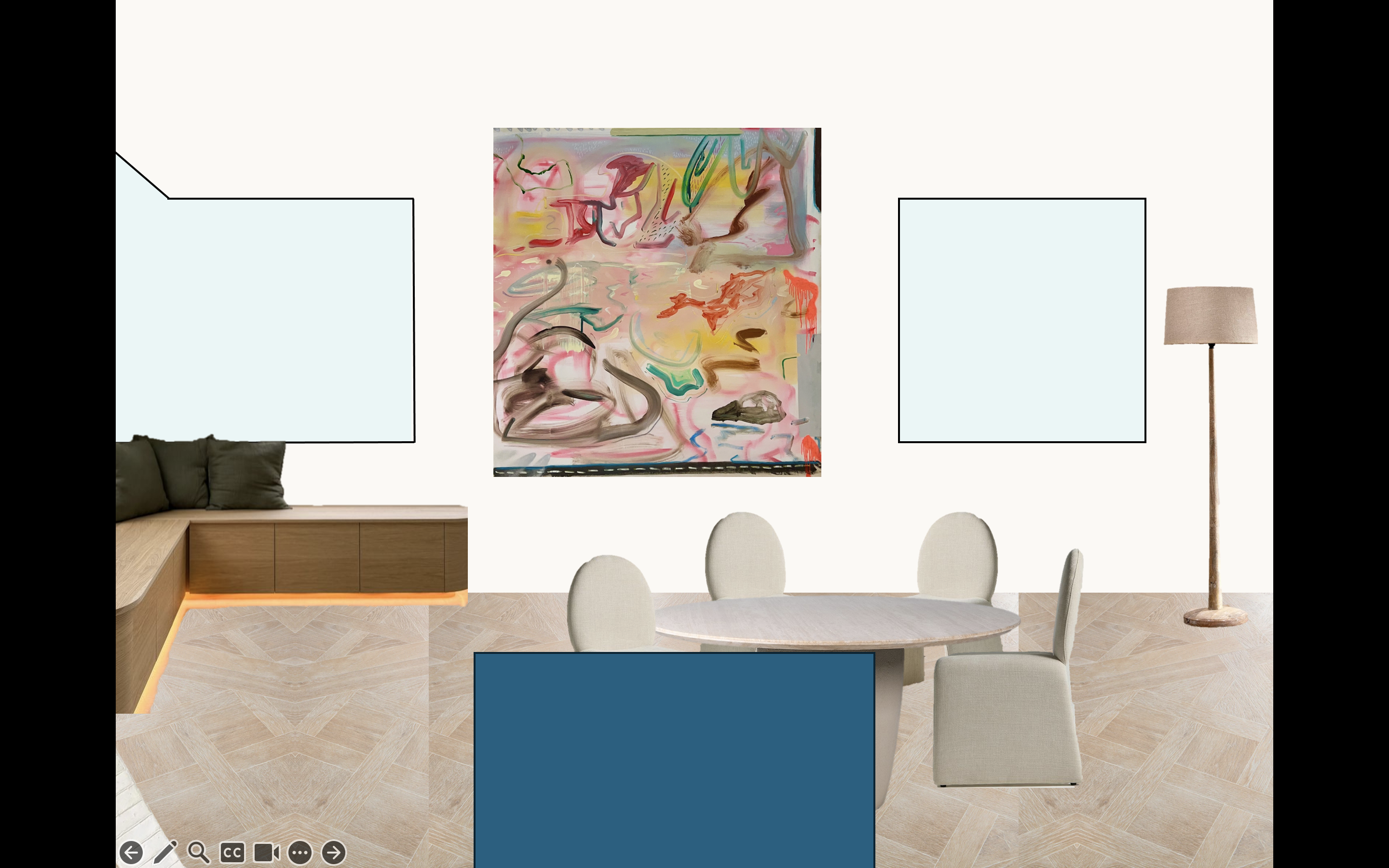 the light blue boxes are windows the dark blue box is a kitchen island