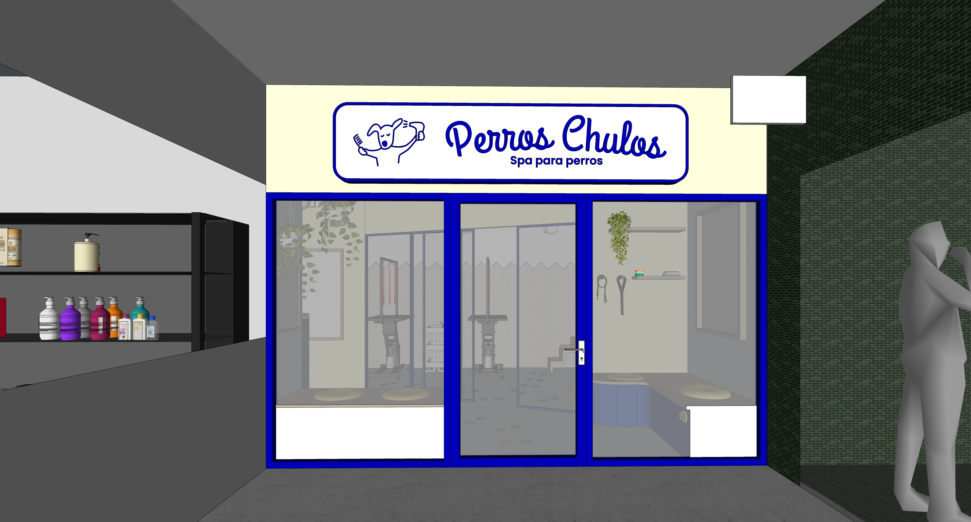 hyper realistic exterior render of a dog grooming and bathing store located inside a modern shopping mall corridor front view of the storefront the facade is composed of floor to ceiling clear glass panels with royal blue metal frames and mullions clean and glossy with realistic reflections and transparency through the glass the interior is visible illuminated with neutral white artificial lighting 4000k at the back of the interior space the dog bathing area is clearly visible featuring white ceramic wall tiles clean glossy and hygienic with subtle reflections and realistic grout lines the grooming and bathing zone looks professional orderly and premium hanging plants and grooming equipment are subtly visible in the mid ground above the storefront a backlit lightbox sign with a white background and royal blue vinyl graphics the sign reads perros chulos spa para perros friendly modern typography evenly illuminated no glare or overexposure the shopping mall corridor includes other commercial stores on both sides with neutral storefront designs display shelving and soft ambient lighting flooring in smooth gray concrete or polished mall flooring clean and contemporary modern minimal mall ceiling and walls with neutral artificial lighting no natural daylight highly realistic materials accurate scale global illumination soft shadows realistic glass reflections architectural photography style straight on camera angle eye level view ultra high resolution 4k hyper realistic render